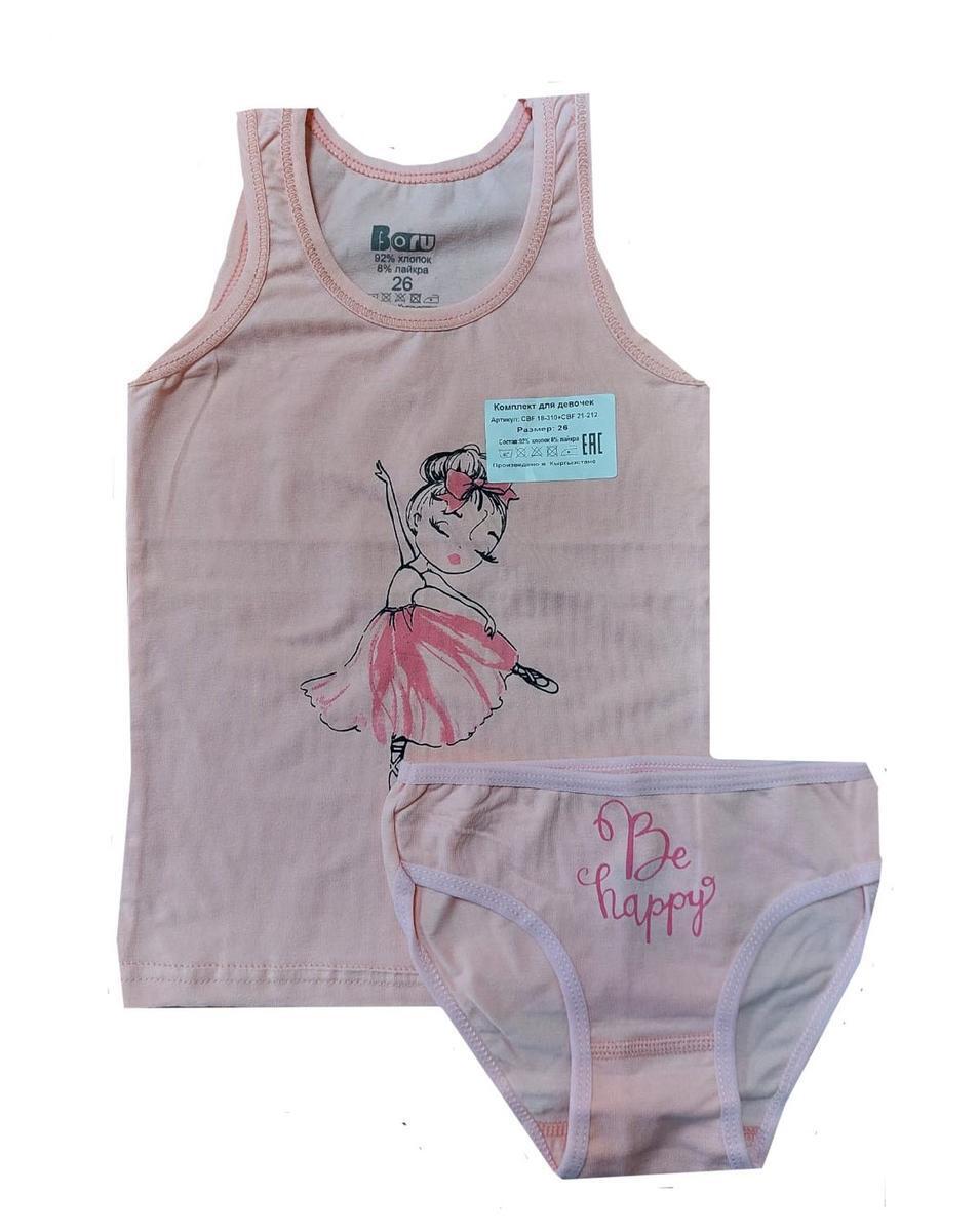 Майка украшена милым принтом с изображением танцующей девочки, а на трусиках размещена надпись “Be happy” – символ позитива и радости. Нежный дымчато-розовый цвет делает комплект идеальным выбором для юных принцесс.