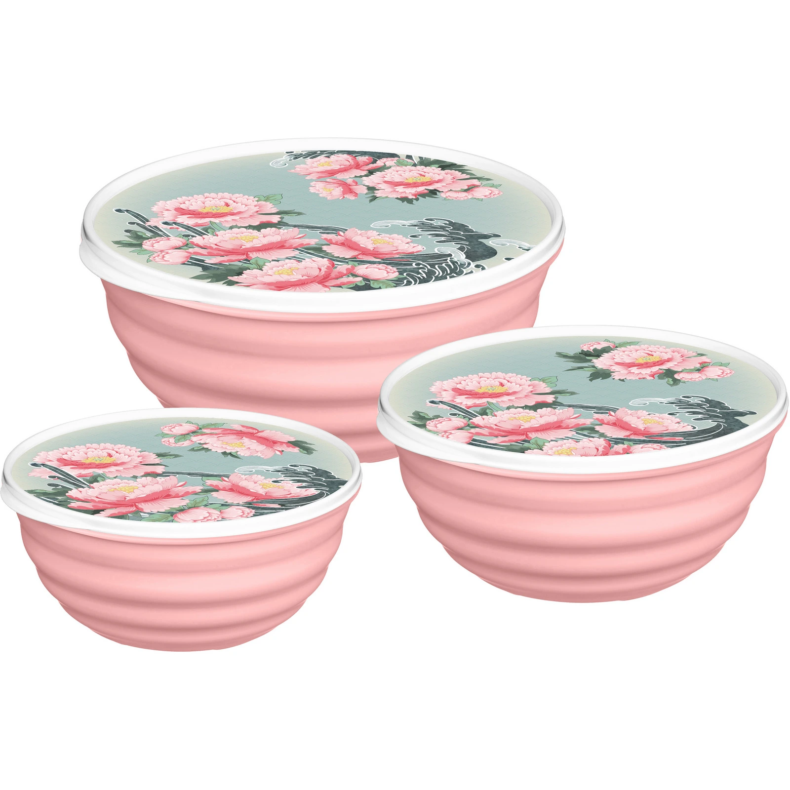 Светло-розовый цвет мисок и изящный цветочный принт на крышках делают комплект гармоничным дополнением кухни и сервировки стола. Это практичный выбор для дома, где ценят порядок, функциональность и эстетичные детали.
