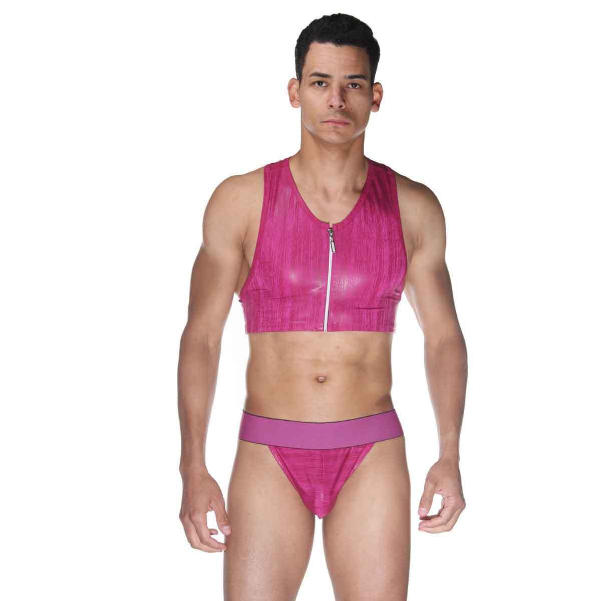 Комплект подходит для мужчин, которые ценят стиль и комфорт в повседневной жизни или на особых мероприятиях. Топ с короткими рукавами и застежкой на молнии легко комбинируется с различными стилями, а трусы-тонги с широкой резинкой обеспечивают надежную поддержку и свободу движений. Этот комплект станет отличным дополнением к вашему гардеробу.