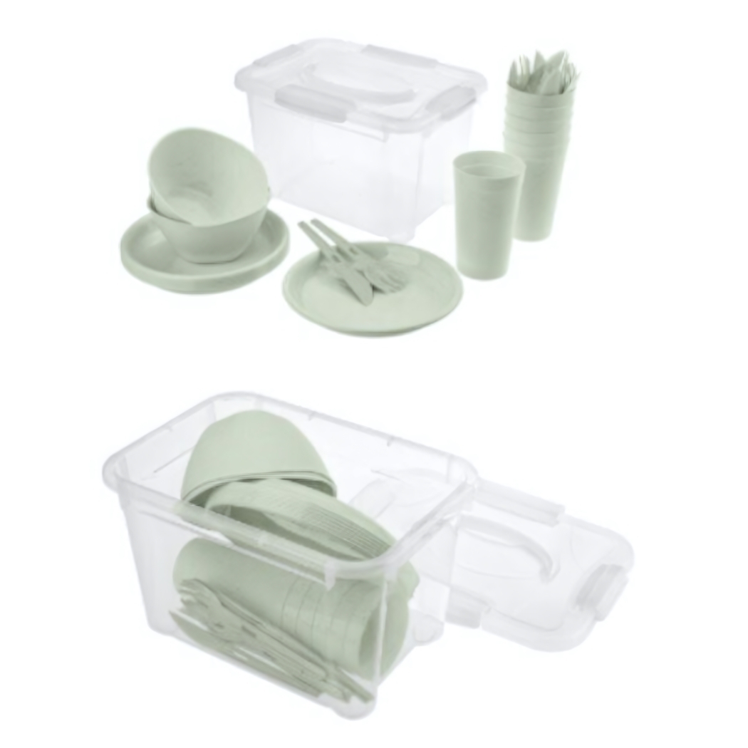 Комплект включает 27 предметов, которые удобно упакованы в прозрачный контейнер с надежной ручкой для переноски. Он легкий и компактный, что позволяет легко брать его с собой в поездки. Внутри вы найдете светло-зеленые пластиковые тарелки, чаши и стаканы, а также вилки, ножи и ложки, выполненные в одном стиле. Такой набор идеально подходит для пикников, кемпинга или просто для обеда на свежем воздухе.