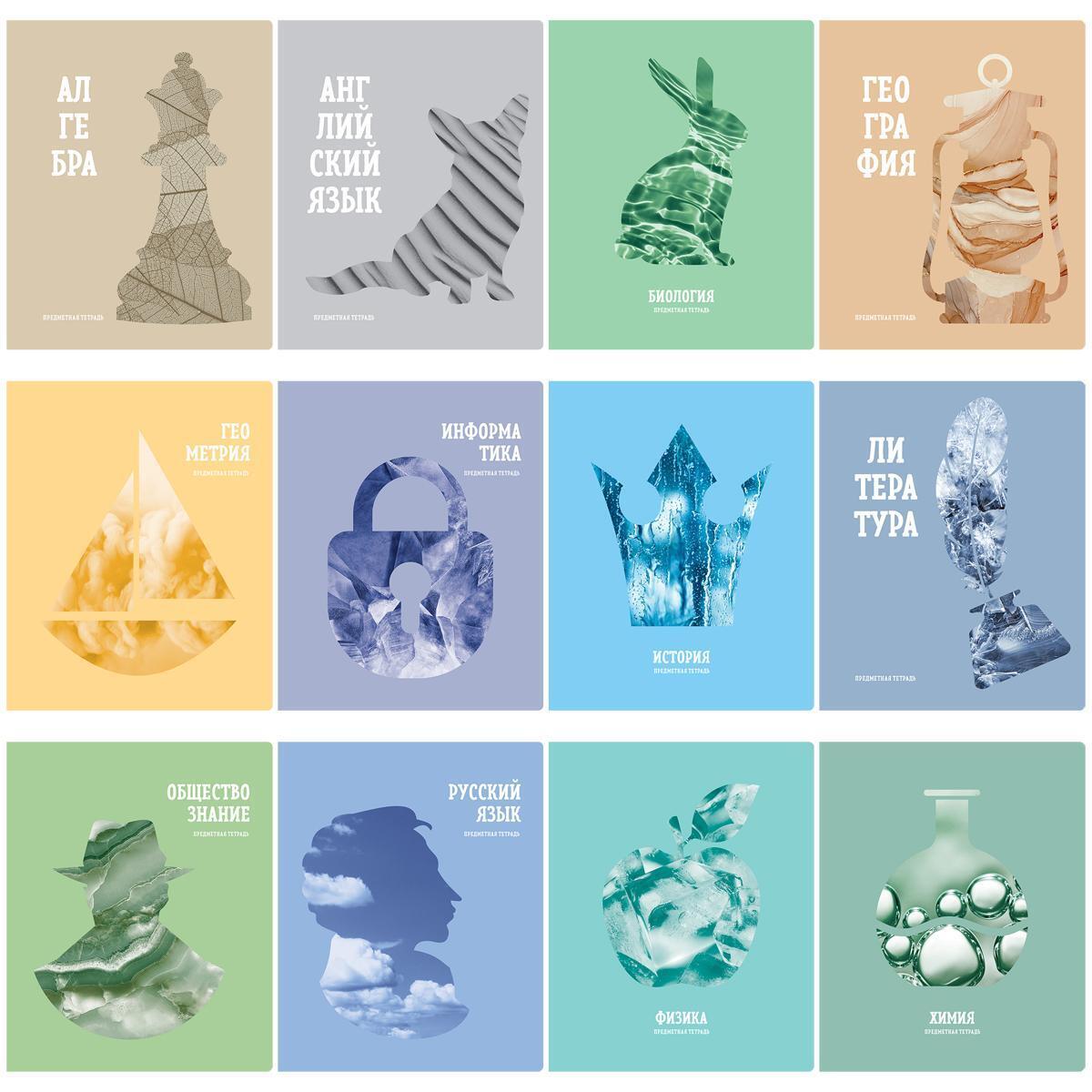 Обложки изготовлены из мелованного картона, прочного и приятного на ощупь, с ярким дизайном и разными цветами – голубой, зеленый, оранжевый, бежевый и другие. Каждая тетрадь украшена графическими элементами, связанными с учебными предметами: алгеброй, геометрией, английским языком, информатикой и другими, что помогает быстро ориентироваться и выбирать нужный учебный материал.