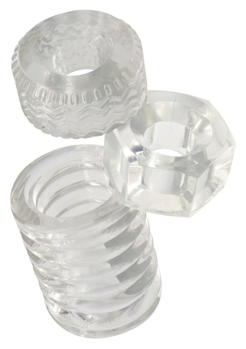 В набор входят 3 изделия разной формы: классическое кольцо, гранёное и модель со спиральной текстурой. Их можно использовать по отдельности или подбирать вариант в зависимости от желаемых ощущений. Эластичный материал легко растягивается и комфортно прилегает, обеспечивая плотную, но мягкую фиксацию.