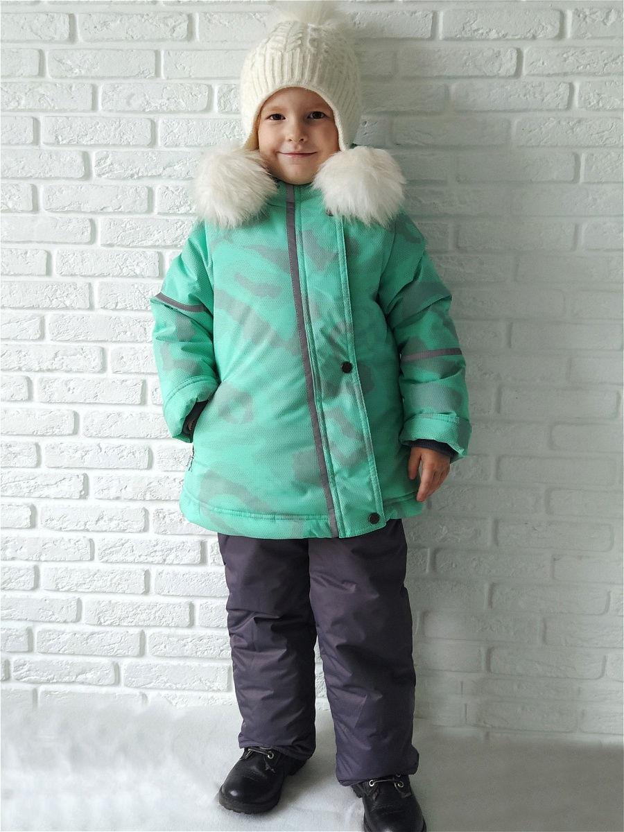 Размер комплекта – 116 см (рост). Куртка выполнена в мятно‑серой гамме с серыми вставками, штаны – в классическом сером цвете. Материал – утеплённый синтетический, устойчивый к износу и легко стирается в машинных режимах при 30 °C.