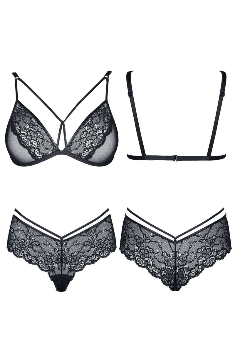 Комплект состоит из двух предметов: бюстгальтера и трусиков. Бюстгальтер украшен кружевным узором с цветочным мотивом, а трусики имеют перекрестные лямки, что добавляет изюминку в общий образ. Этот комплект станет отличным выбором для создания стильного и сексуального образа.
