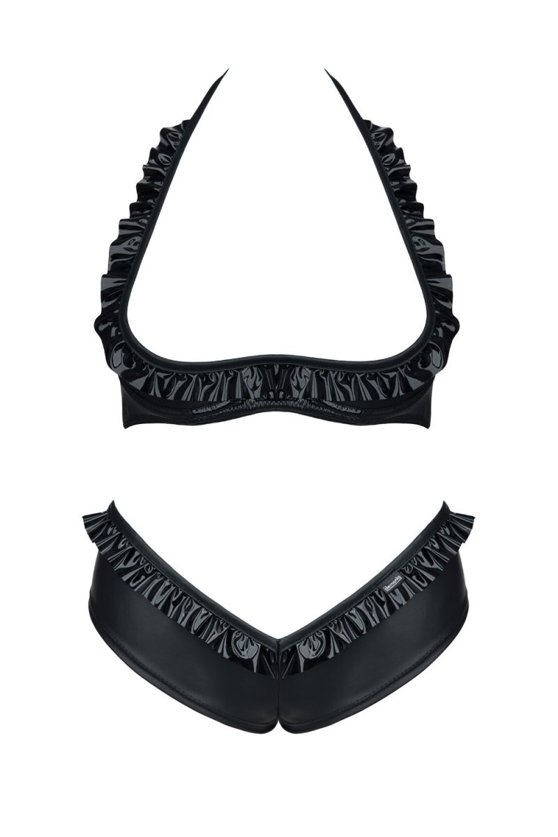 - Бюстгальтер с открытой грудью: глянцевая отделка, оборки по краю, регулируемая шлейка на шее.
