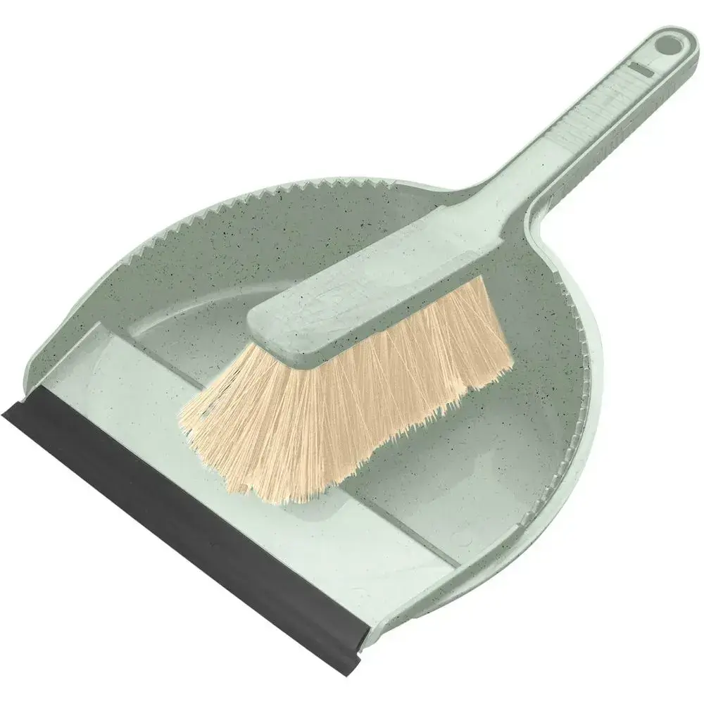 Совок полукруглой формы (24х18 см) с плоским основанием. Щетка шириной 20 см с прямой деревянной ручкой. Цветовое решение: светло-зеленый совок с декоративными черными вкраплениями и натуральный оттенок щетины.