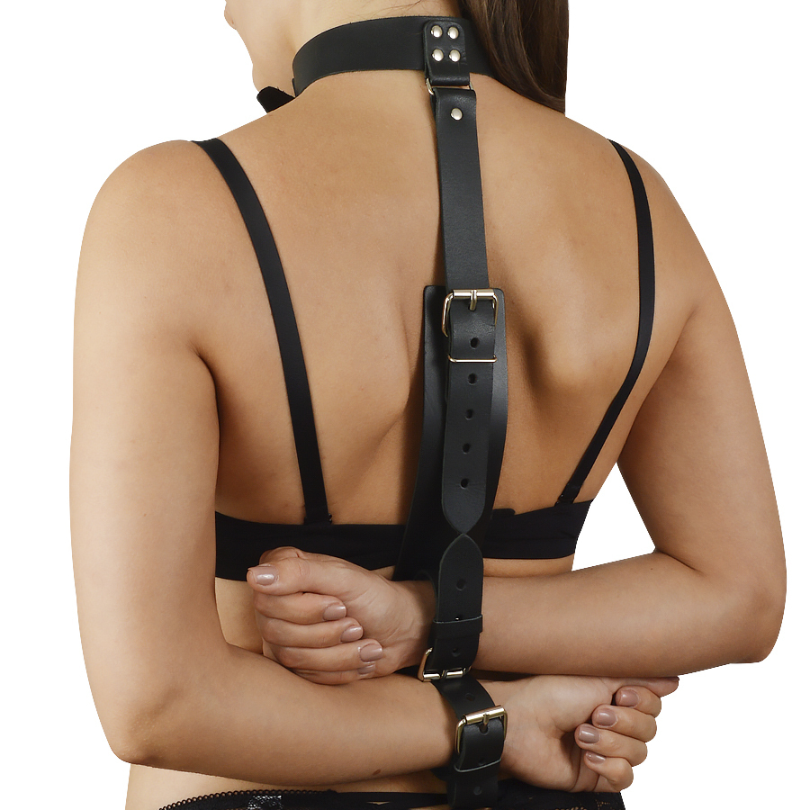 Комплект включает в себя ошейник и наручники, которые фиксируются на основе, что обеспечивает надежность и безопасность во время использования. Металлические пряжки позволяют быстро и удобно регулировать длину, а черный цвет добавляет элегантности и стиля. Этот аксессуар подходит для различных сценариев и может использоваться как в домашних условиях, так и в более открытых пространствах.