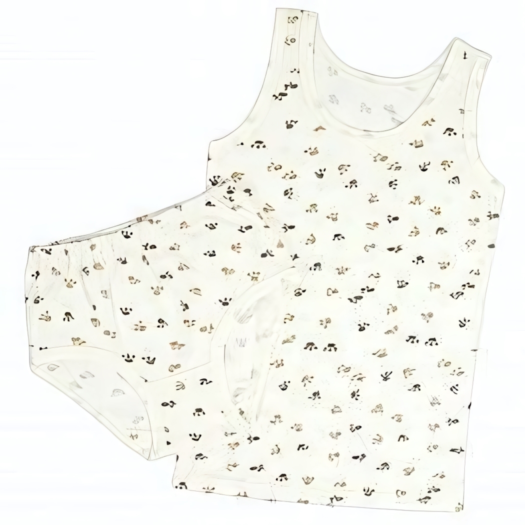 Комплектация включает 1 майку с округлым вырезом и 1 трусики классического кроя. Цветовая гамма представлена в нежных пастельных оттенках с деликатным принтом.