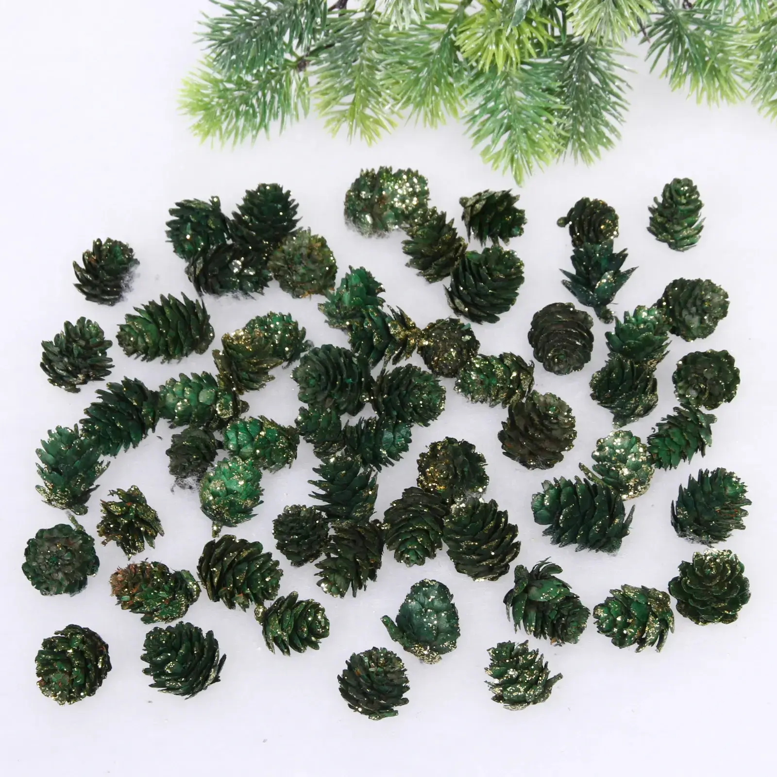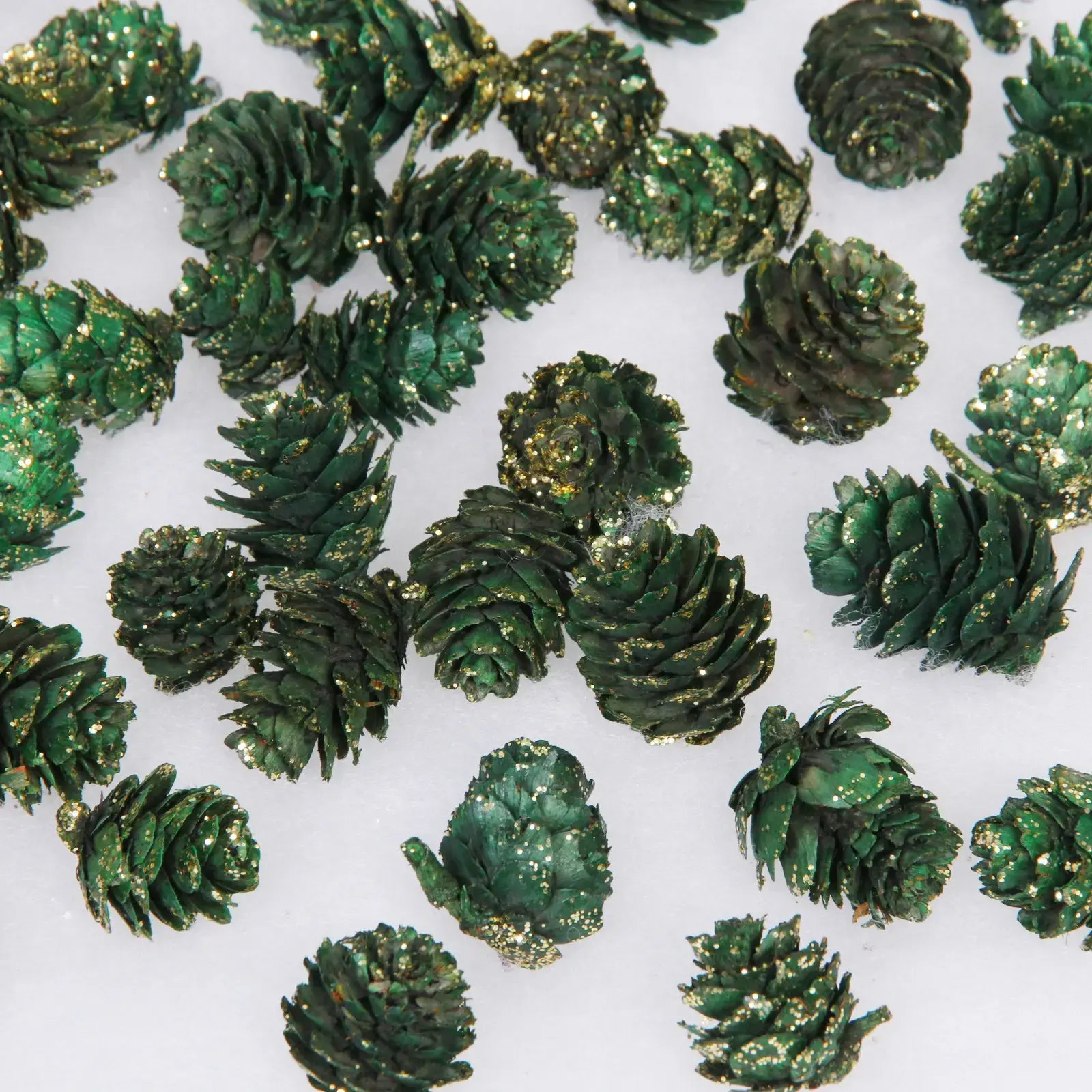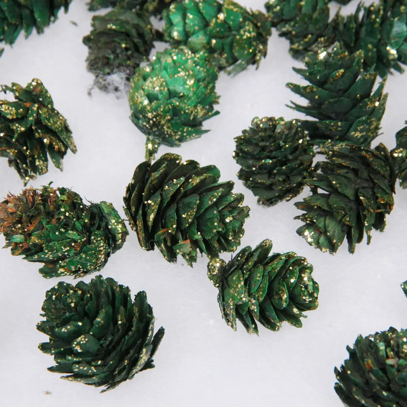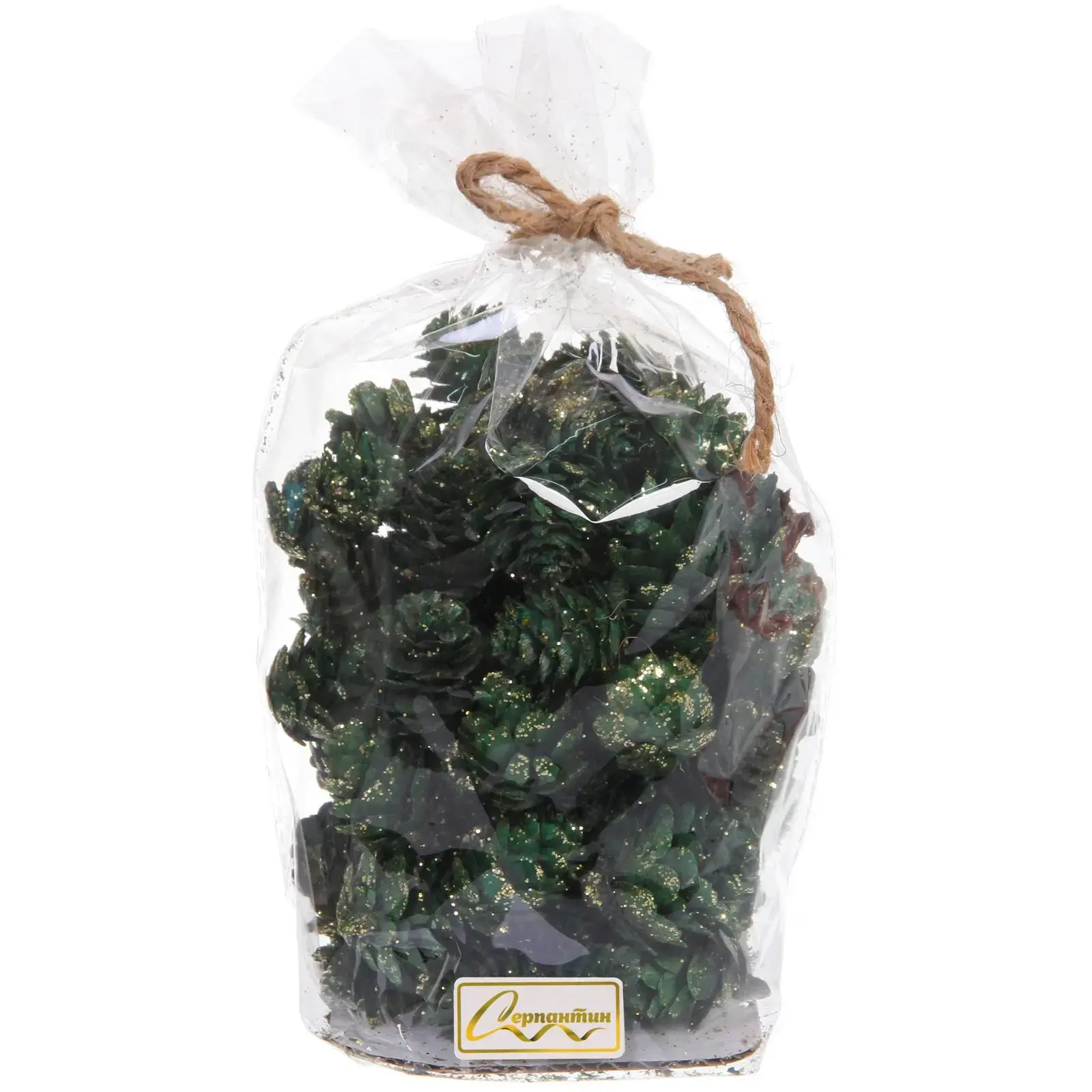 Шишки окрашены стойкими красителями, которые не осыпаются при использовании. Золотистые блестки создают эффект снежного мерцания, а изумрудный цвет гармонирует с классической новогодней палитрой. Компактная упаковка с шершавой веревкой позволяет сразу использовать декор без дополнительной подготовки.