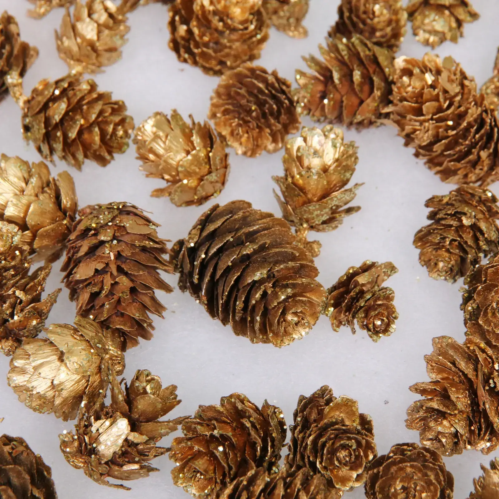 Натуральные декоративные шишки с золотистым покрытием и блёстками — идеальное решение для оформления интерьера, новогоднего декора или творческих проектов. Их благородный оттенок и мерцающая текстура добавят элегантности любой композиции.