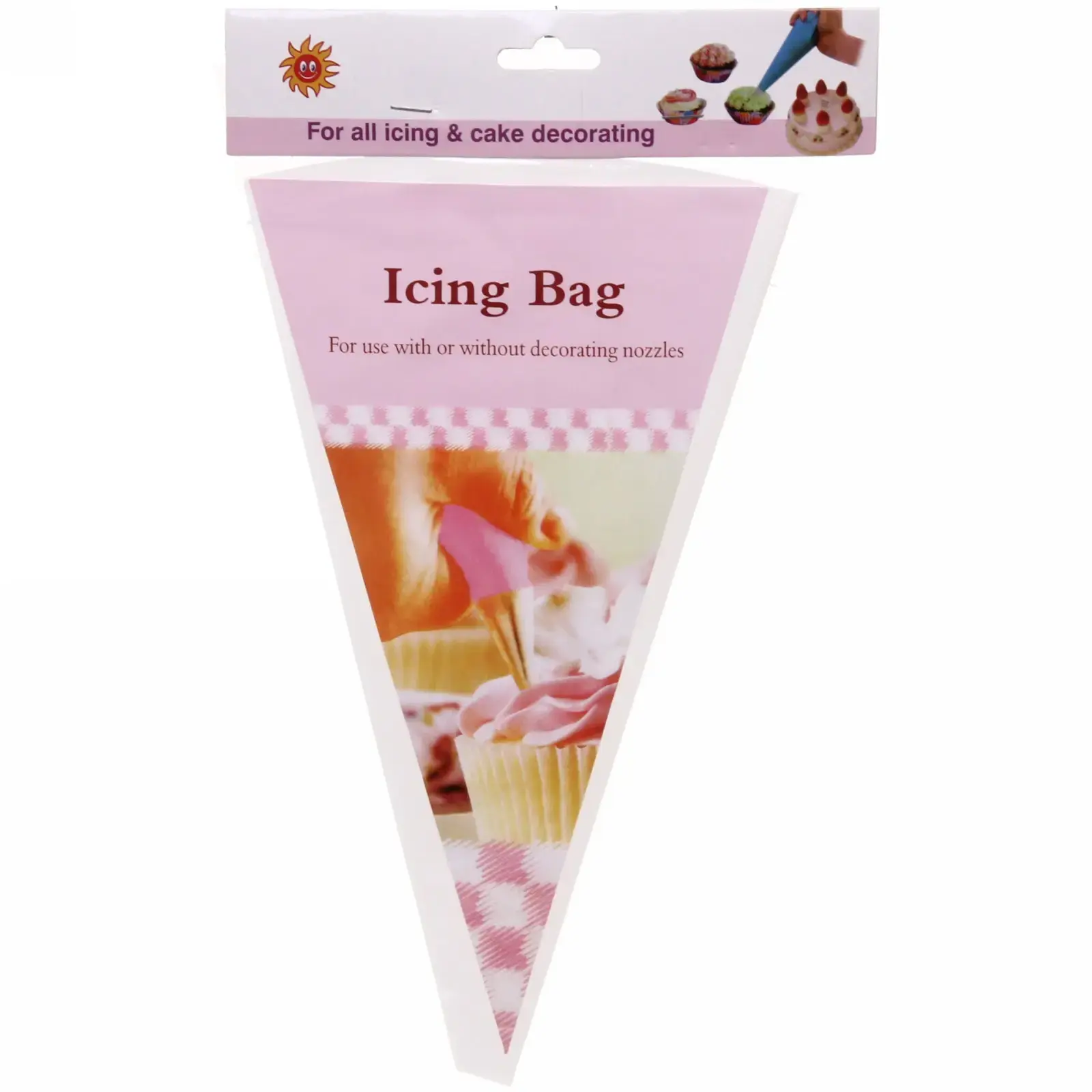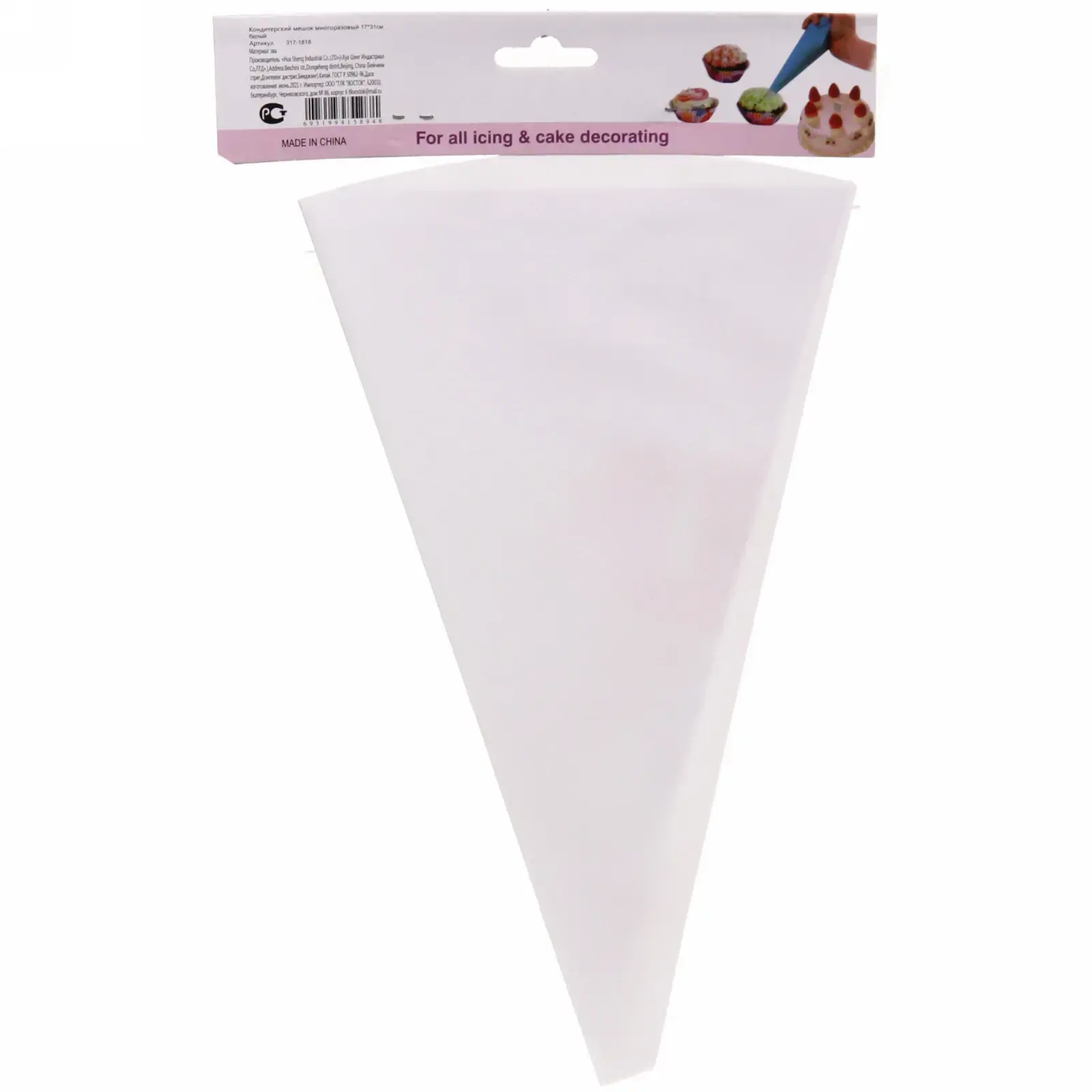 Мешок выполнен в белом цвете и имеет треугольную форму, что обеспечивает удобство при работе. Он упакован в прозрачную пленку, что позволяет видеть его качество и состояние. На упаковке указаны инструкции по использованию, что делает его идеальным выбором для тех, кто только начинает свой путь в кондитерском искусстве.