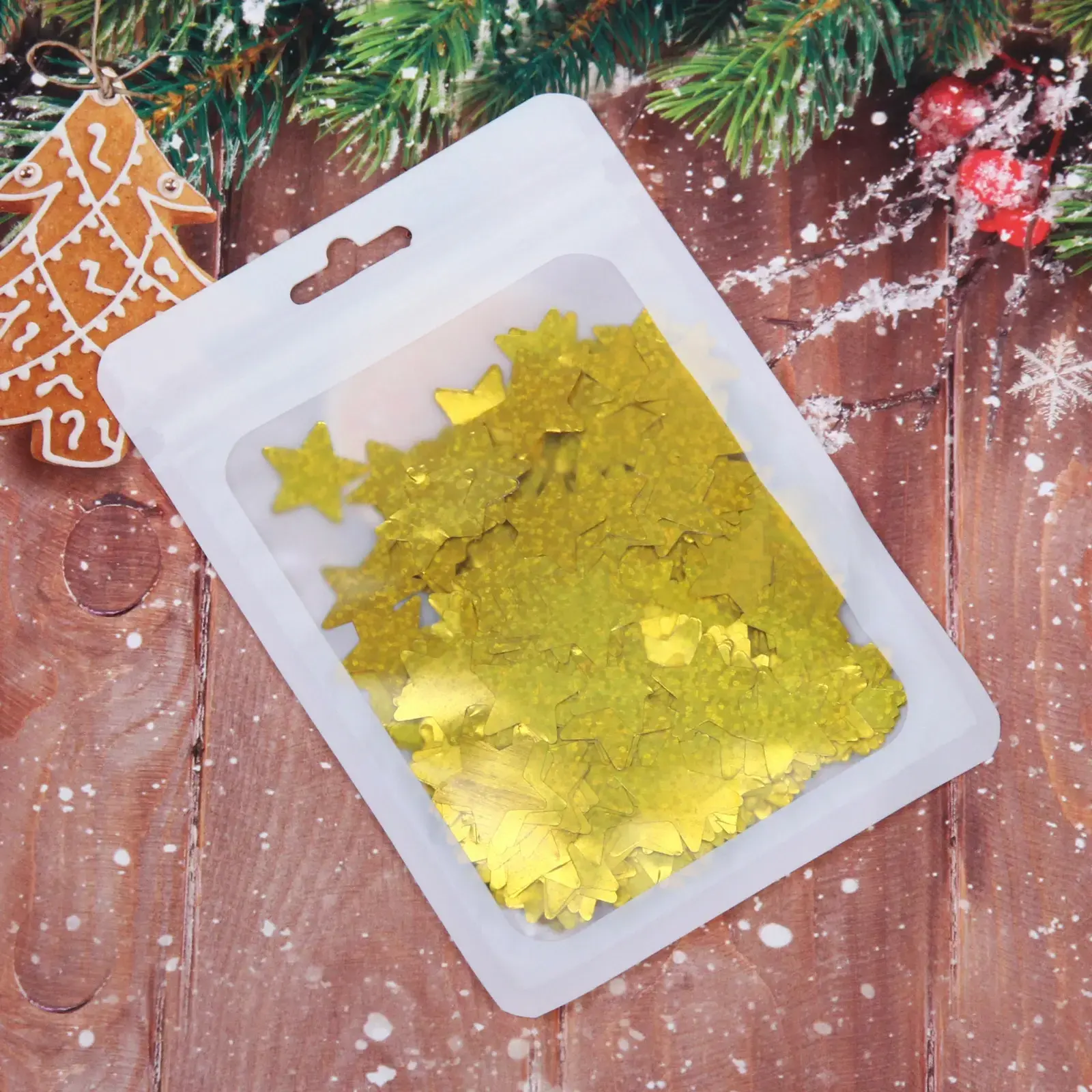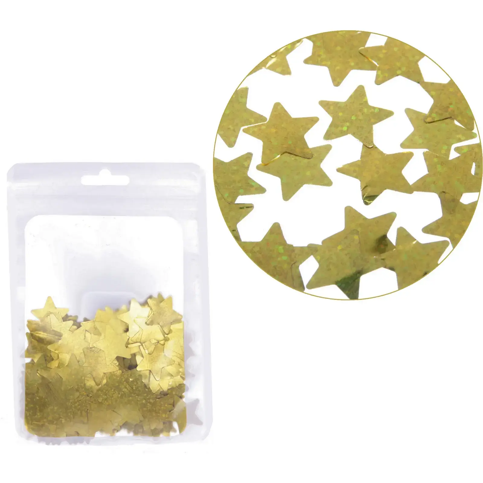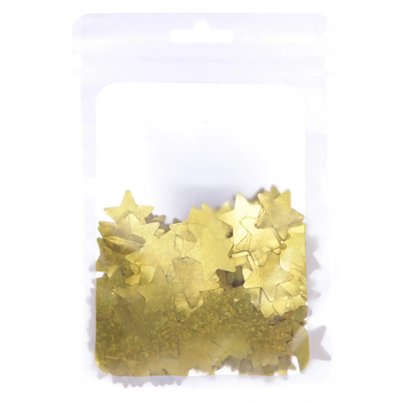 Конфетти имеют форму пятиконечных звездочек и выполнены в ярком золотом цвете с блестящей отделкой. Они упакованы в прозрачный пакет, что позволяет легко видеть содержимое. Эти звездочки станут отличным дополнением к любому празднику, добавляя нотку волшебства и радости.