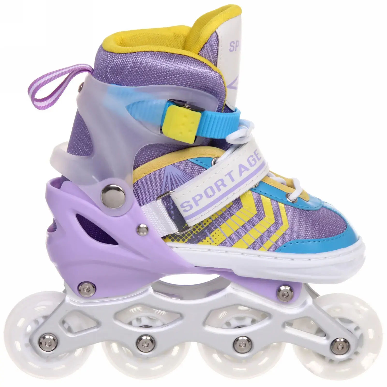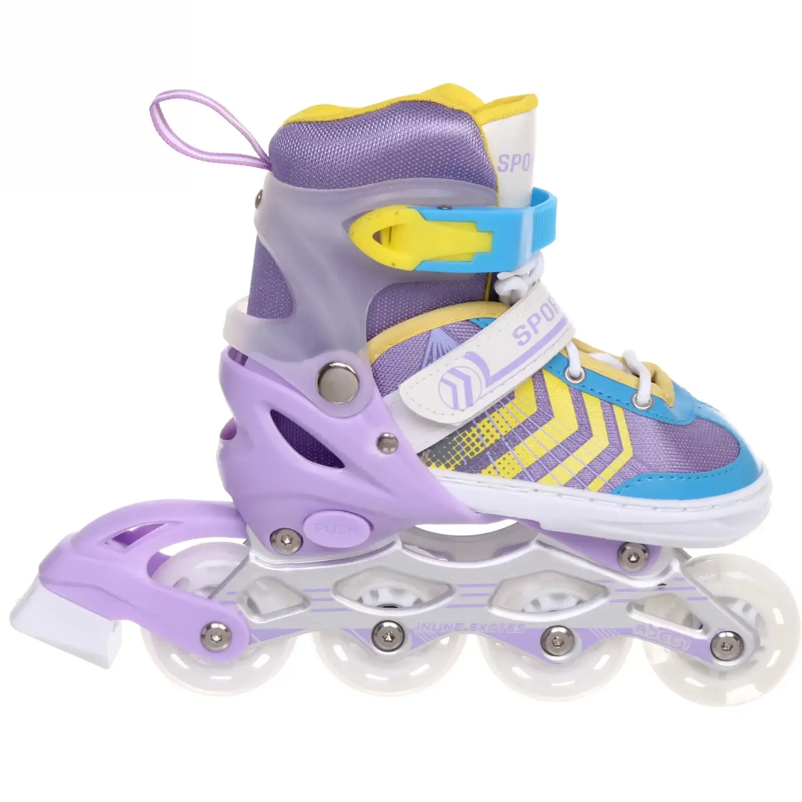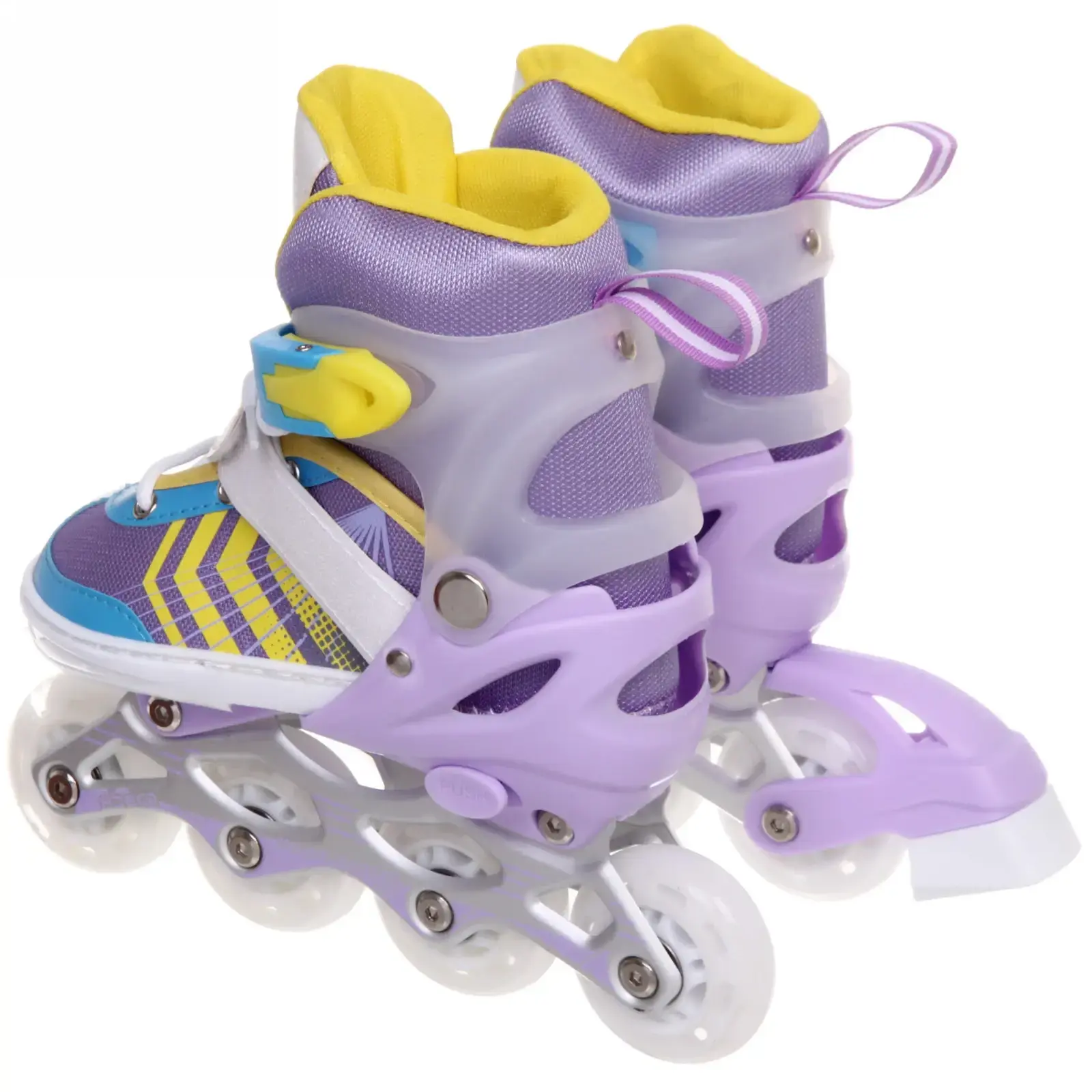 Яркий фиолетово-жёлтый дизайн с геометрическими принтами понравится детям, а практичность конструкции оценит каждый родитель. Коньки полностью готовы к использованию — просто наденьте и зафиксируйте!
