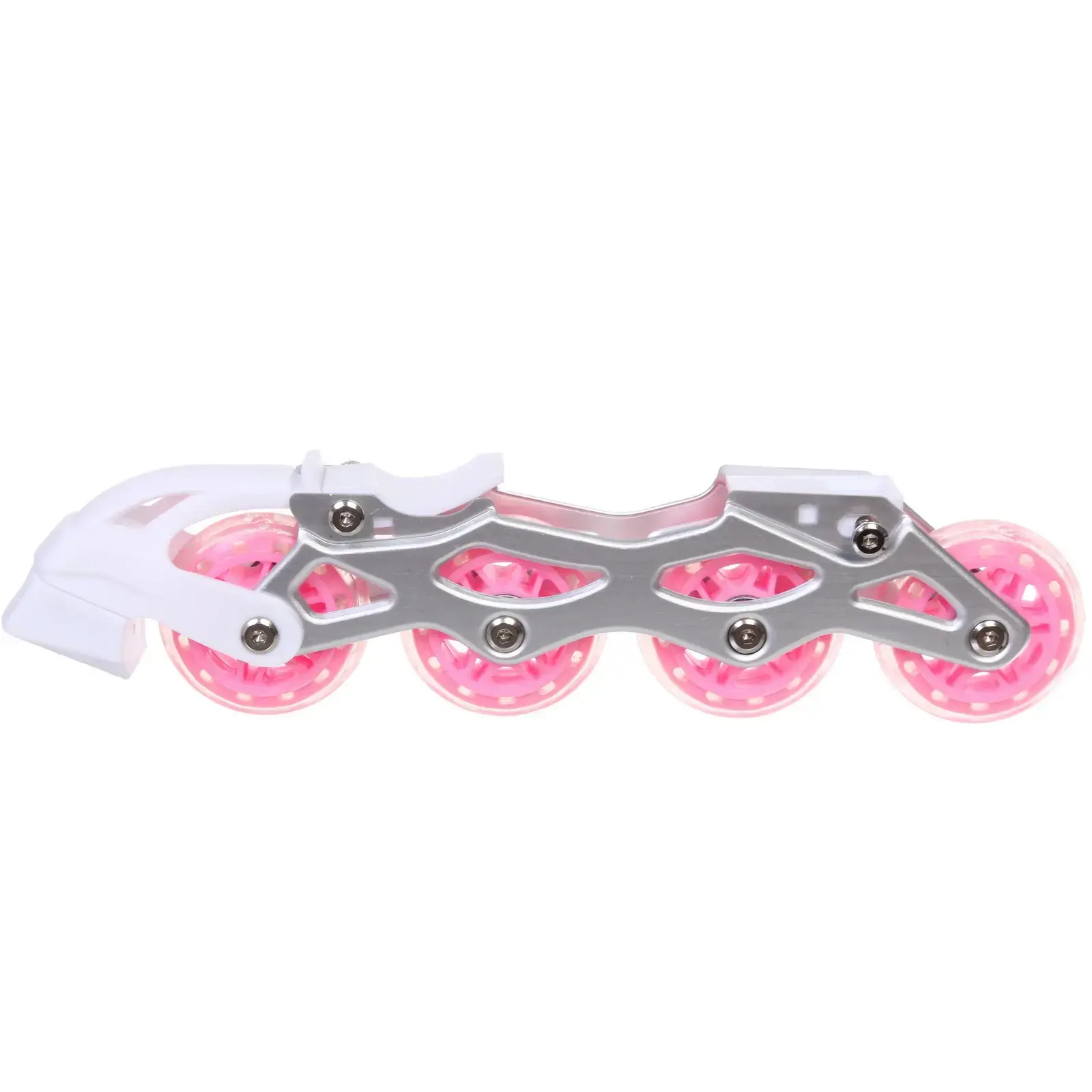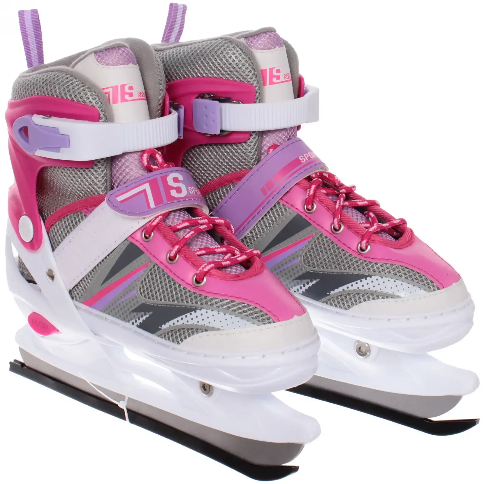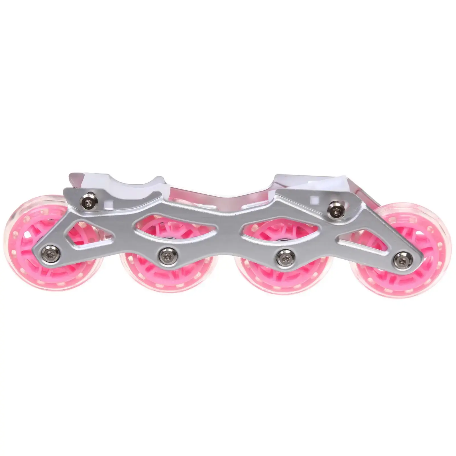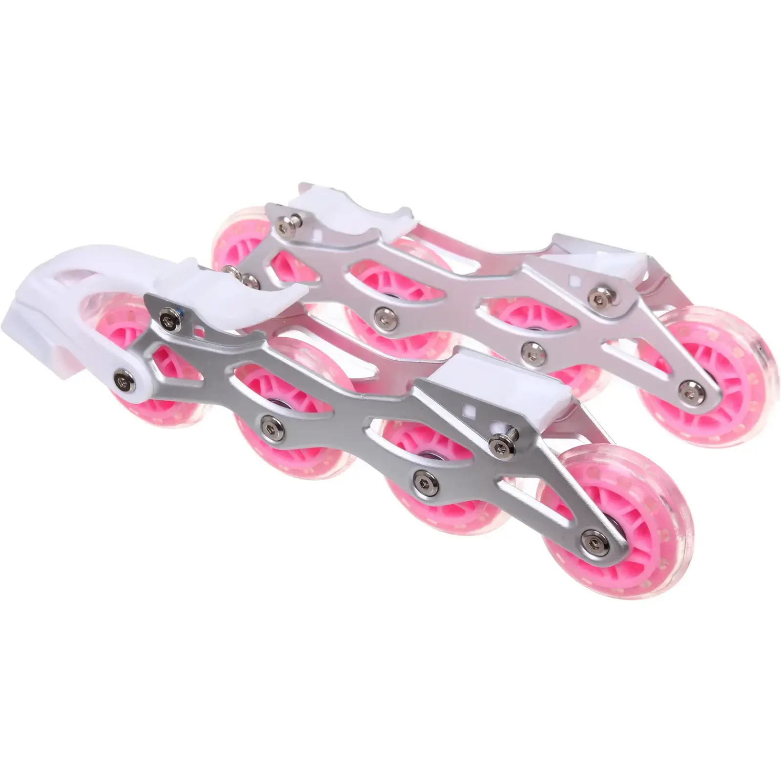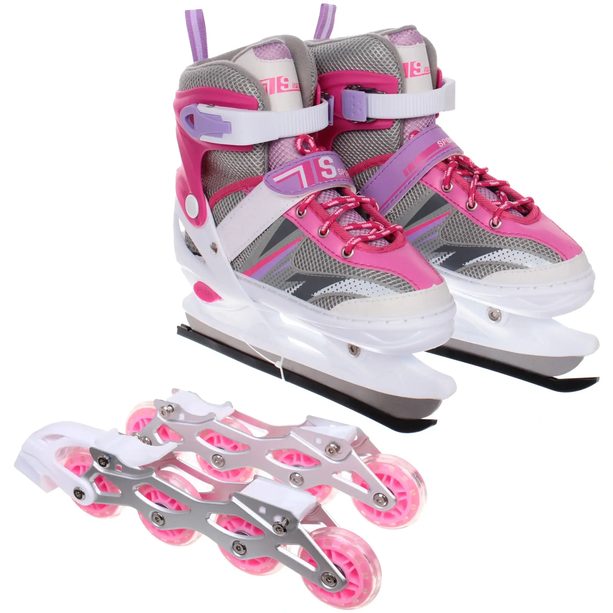 Конструкция коньков выполнена из прочных материалов, таких как пластик и полиэстер, что гарантирует долговечность и надежность. Высокая поддержка щиколотки и мягкая подкладка обеспечивают комфорт даже при длительном использовании. Лезвия из стали обеспечивают отличное скольжение по льду, а роликовые блоки позволяют кататься по гладким поверхностям. Яркий дизайн в сочетании с розовыми и серыми элементами делает коньки привлекательными для детей.