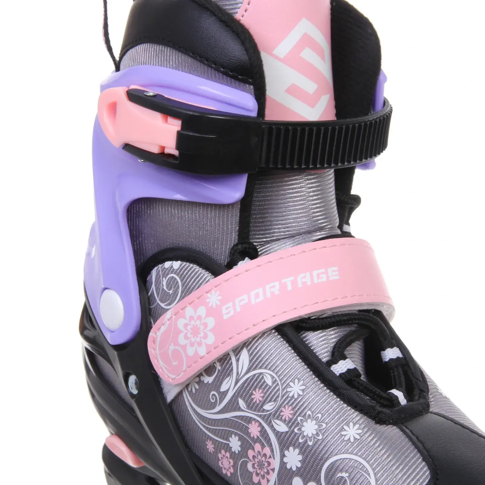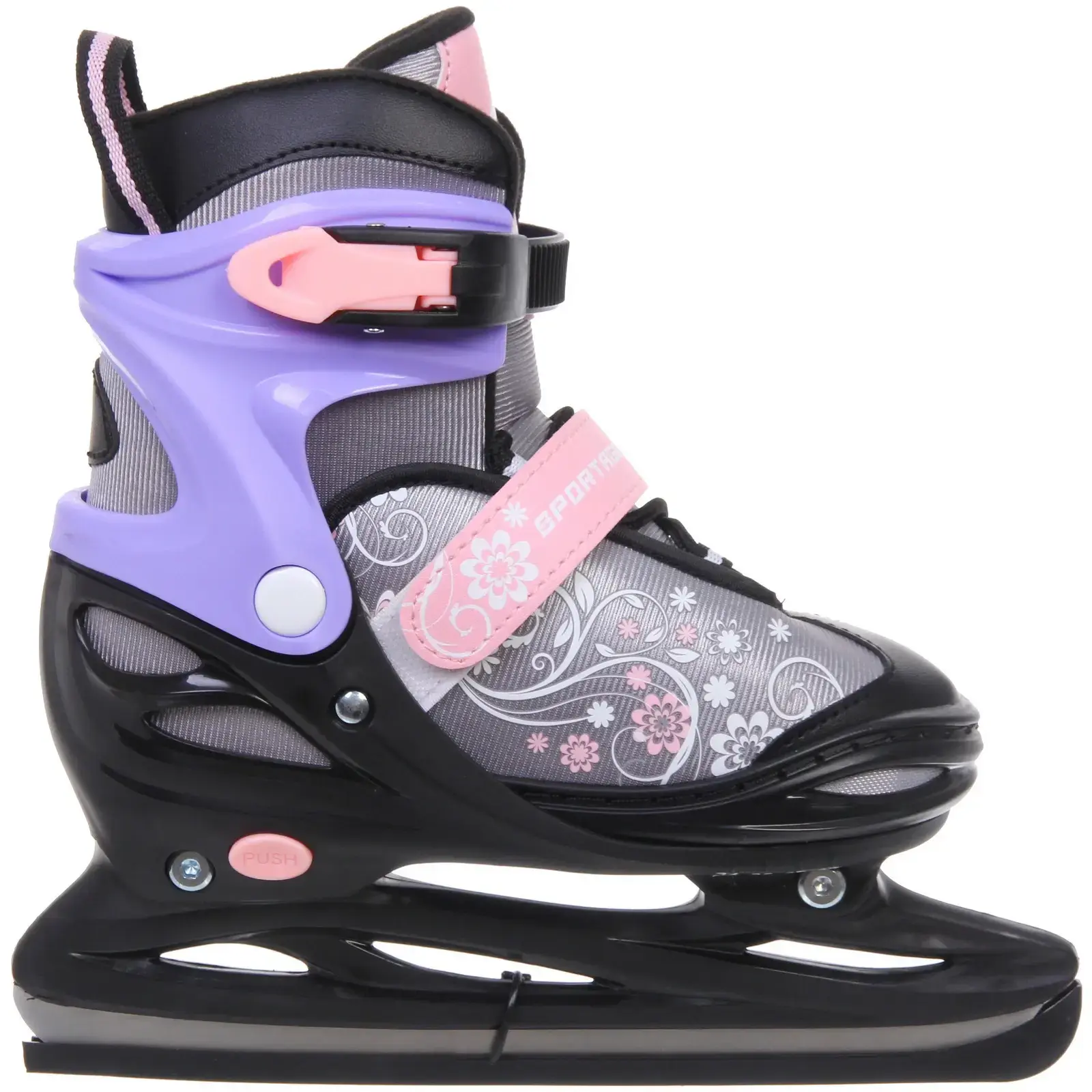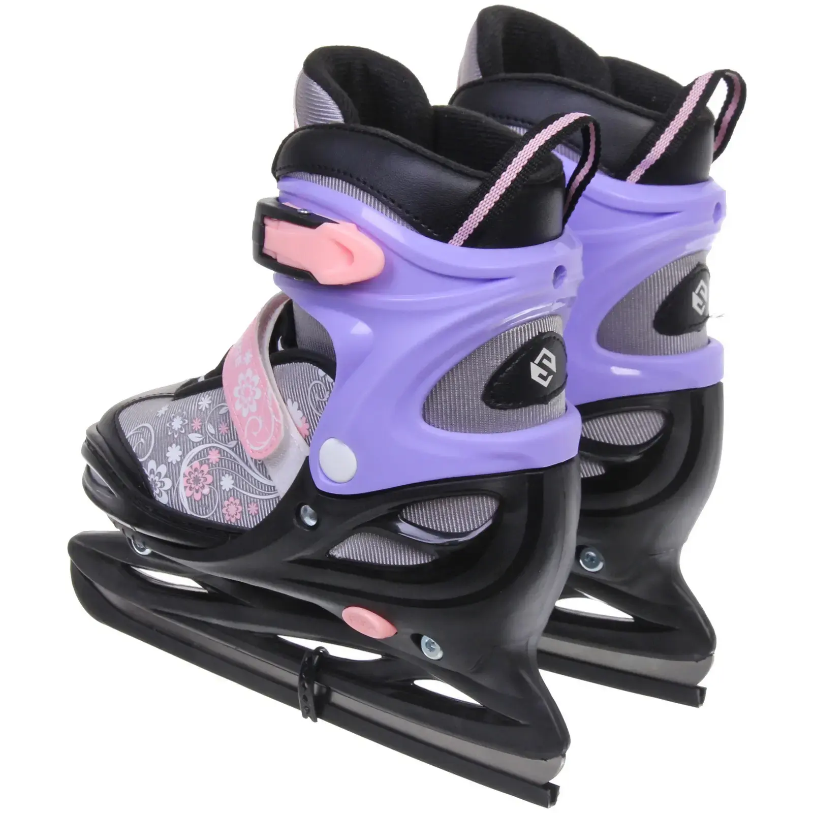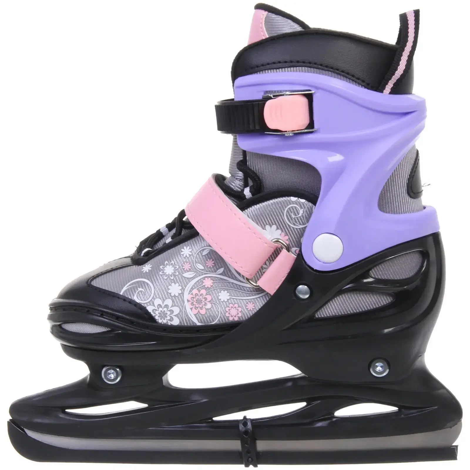 Коньки легко надеваются и снимаются благодаря удобной системе застежек, включающей пластиковую пряжку и шнуровку. Они идеально подходят для катания на льду, как для тренировок, так и для веселых выходных на катке. Яркий и стильный дизайн с цветочными узорами делает их привлекательными для детей и подростков.