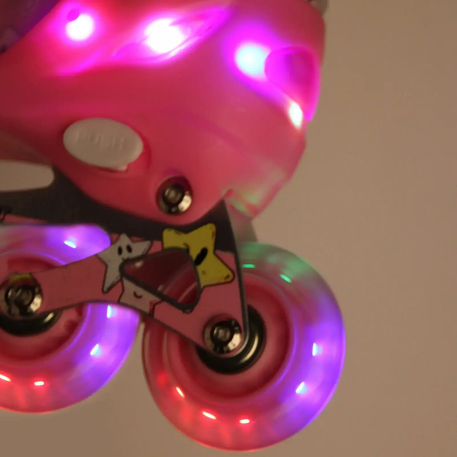 Яркие роликовые коньки с подсветкой колес созданы для комфортного катания детей. Набор включает шлем и защиту локтей/коленей — всё необходимое для первых шагов на роликах.