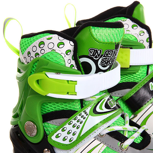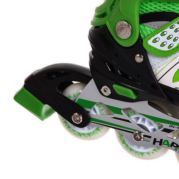 Коньки имеют четыре колеса, расположенные в ряд, что обеспечивает отличную маневренность и скорость. Колеса белого цвета с зелеными узорами добавляют стильный акцент. Размеры коньков позволяют использовать их как для начинающих, так и для более опытных катальщиков. Эти коньки — отличный выбор для подарка, который принесет радость и активные моменты вашему ребенку.