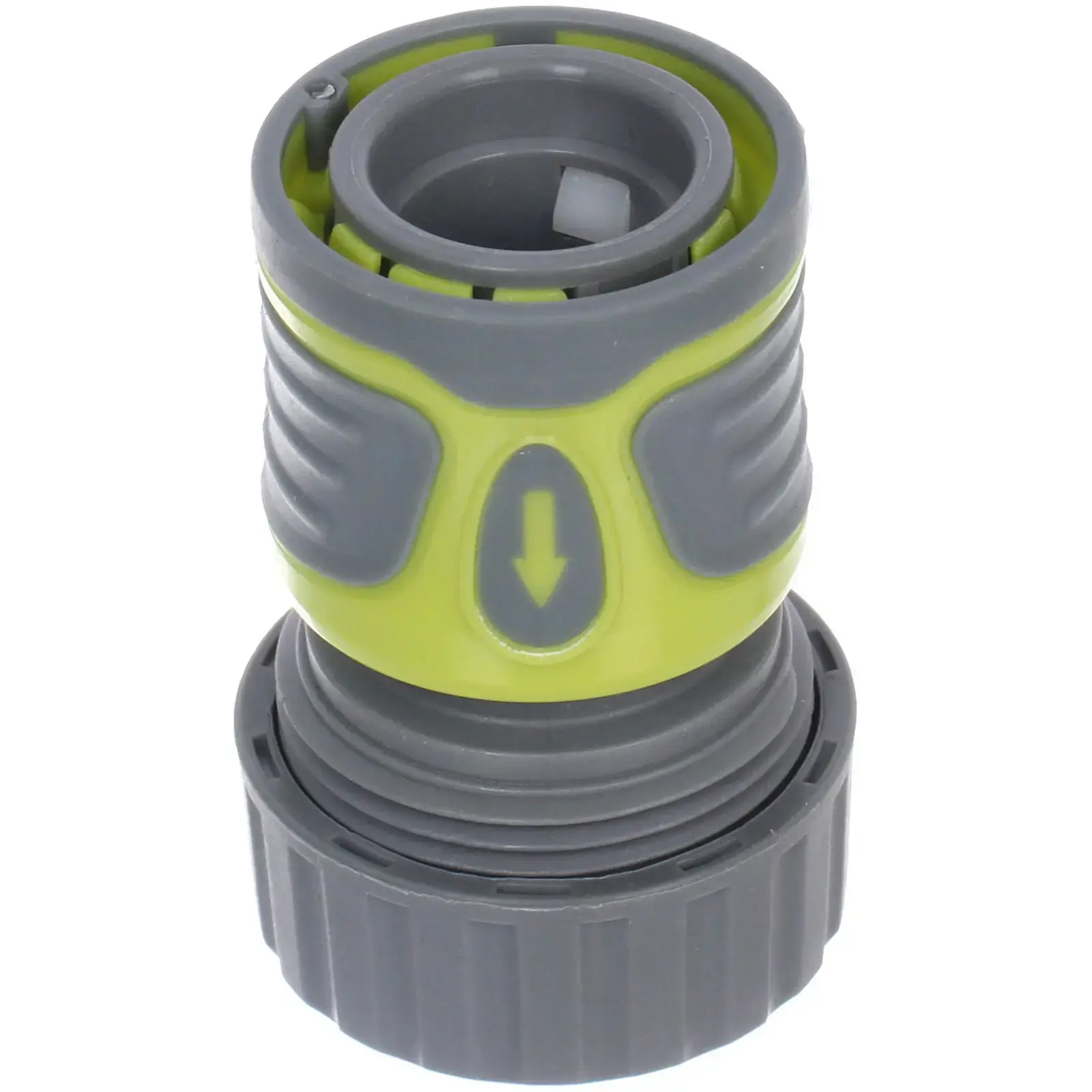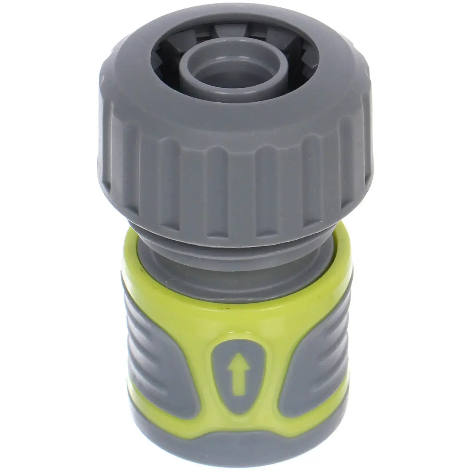Коннектор имеет цилиндрическую форму с комбинацией серого и зеленого цветов. Верхняя часть с рифленой текстурой обеспечивает надежный захват, а нижняя часть с гладкой поверхностью содержит стрелку, указывающую направление потока воды.