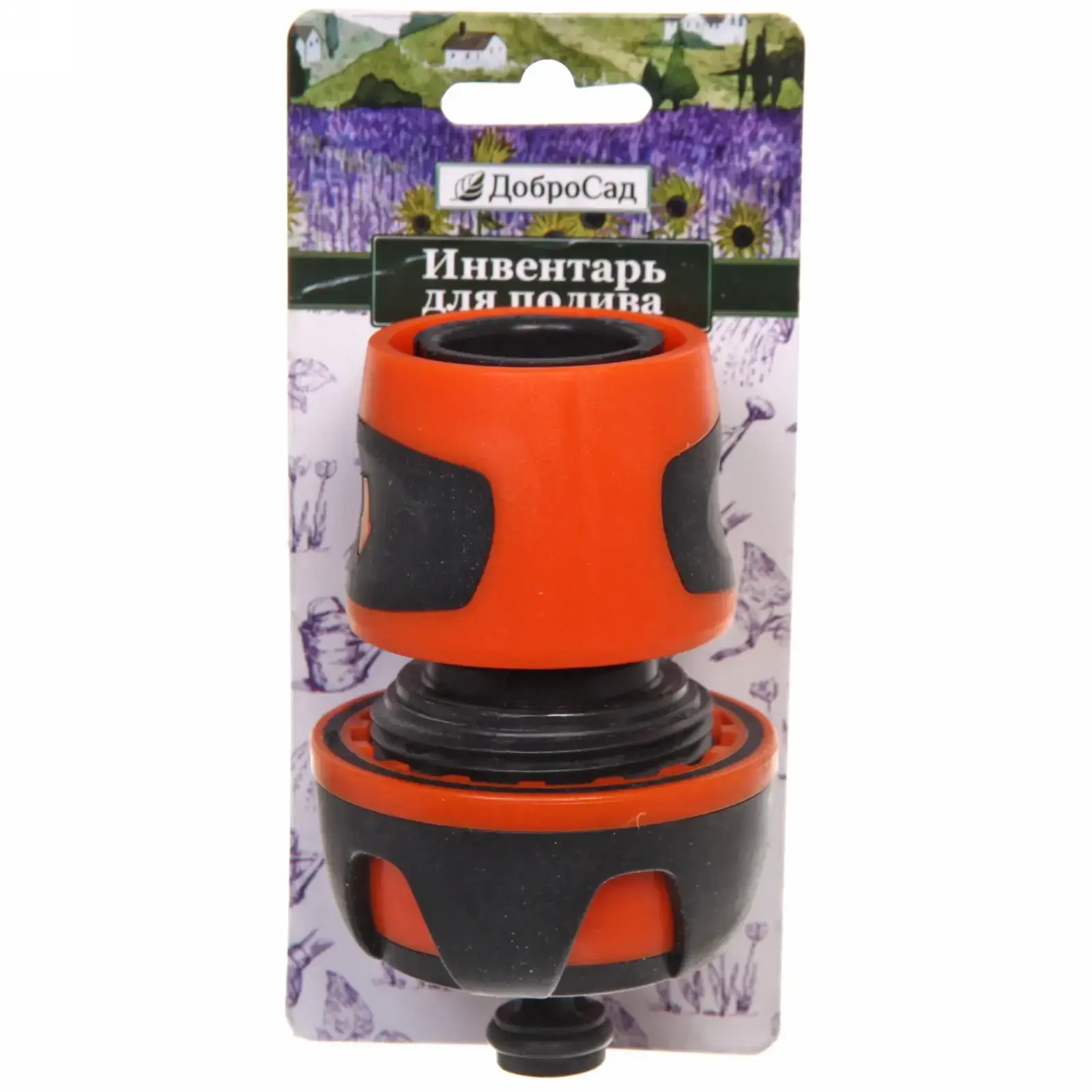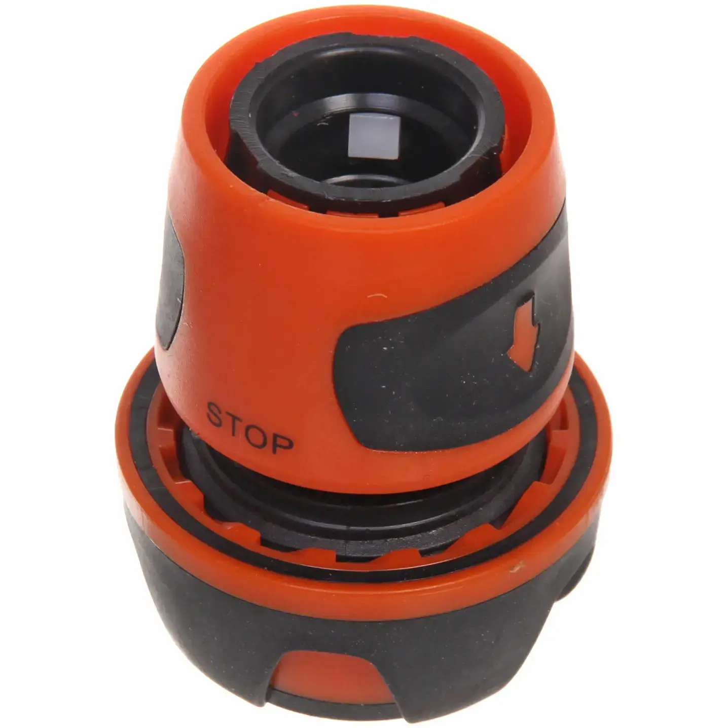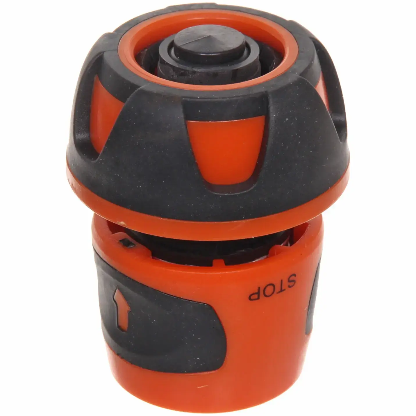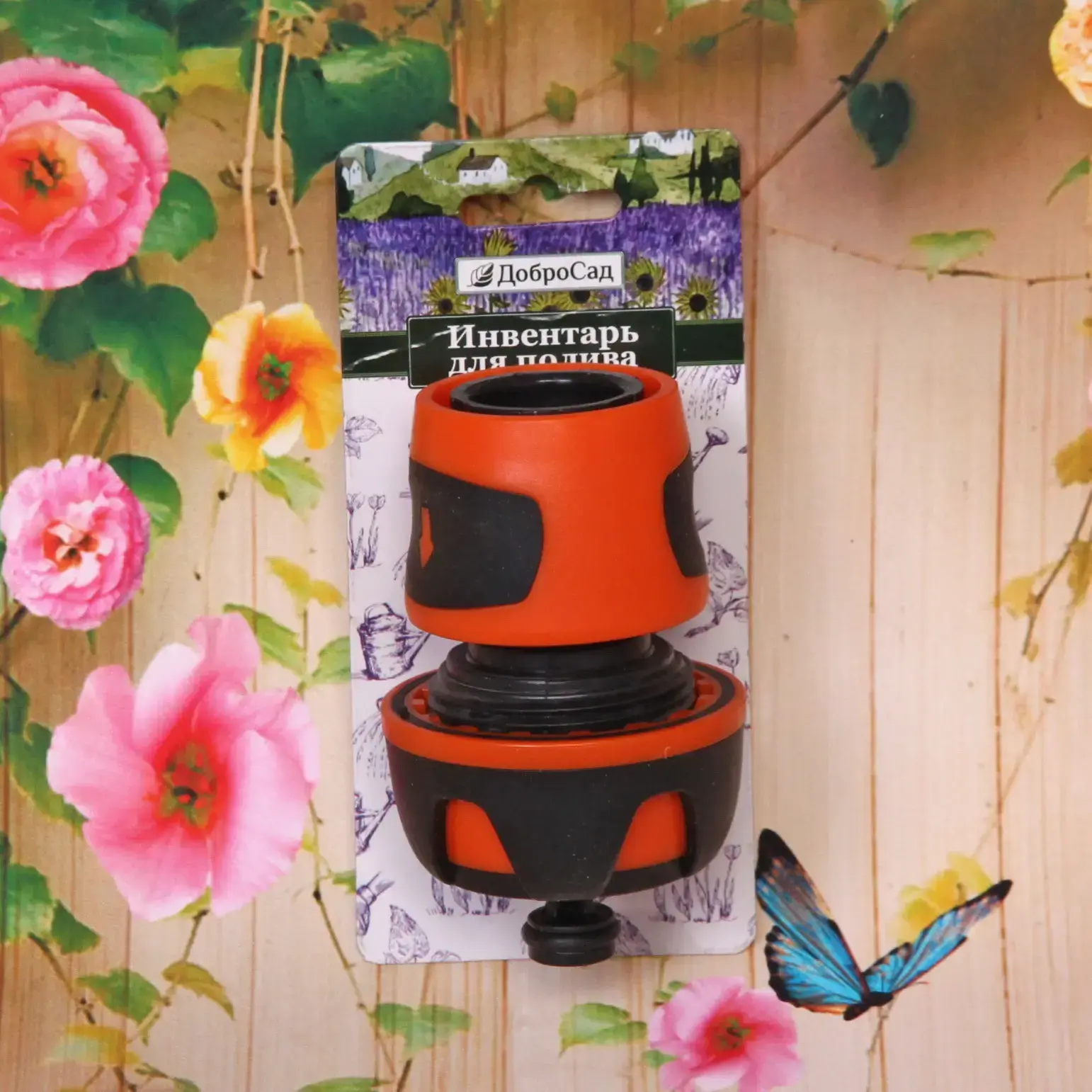 Коннектор выполнен из качественного пластика, что гарантирует его долговечность и надежность. Он имеет стандартный размер 3/4», что делает его совместимым с большинством поливочных систем. Оранжевый цвет с черными вставками не только привлекает внимание, но и делает его заметным в саду.