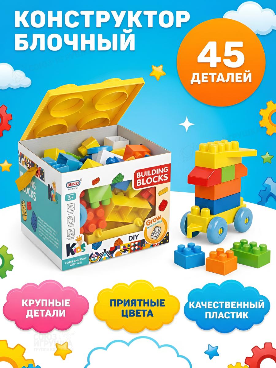 Блочный конструктор из 45 деталей помогает ребенку создавать собственные модели и превращать игру в увлекательное обучение. Крупные элементы удобно держать маленькими руками, а яркие цвета делают процесс сборки интересным и понятным даже для малышей от 3 лет.