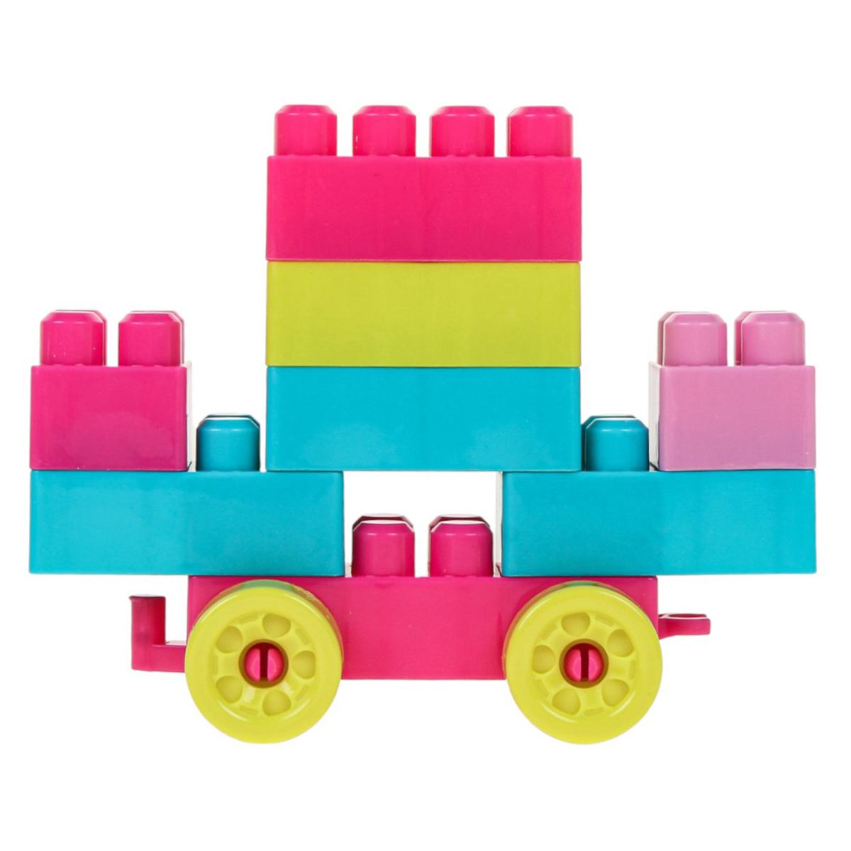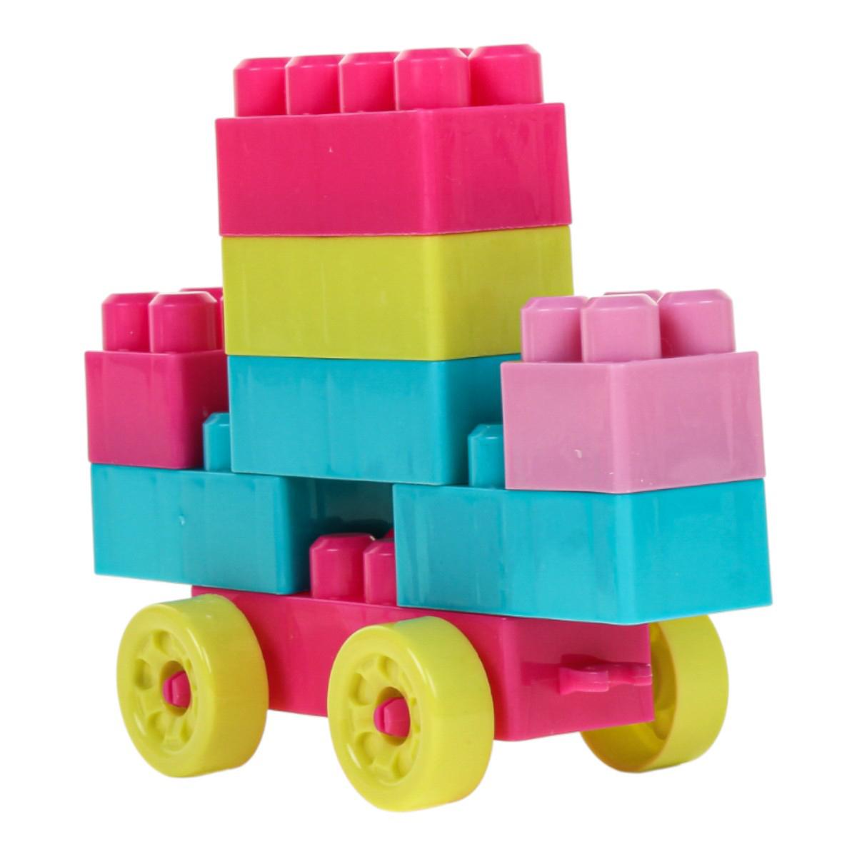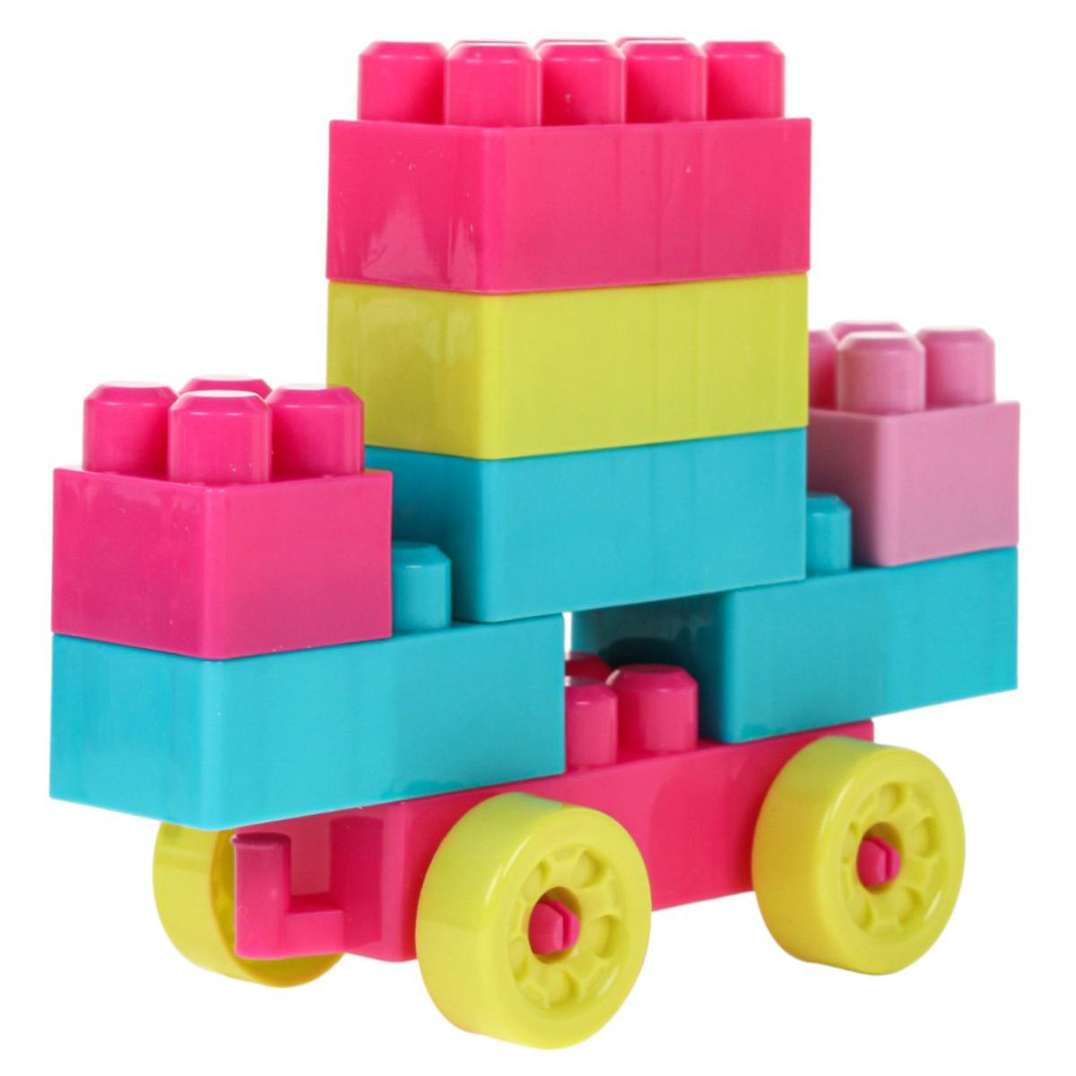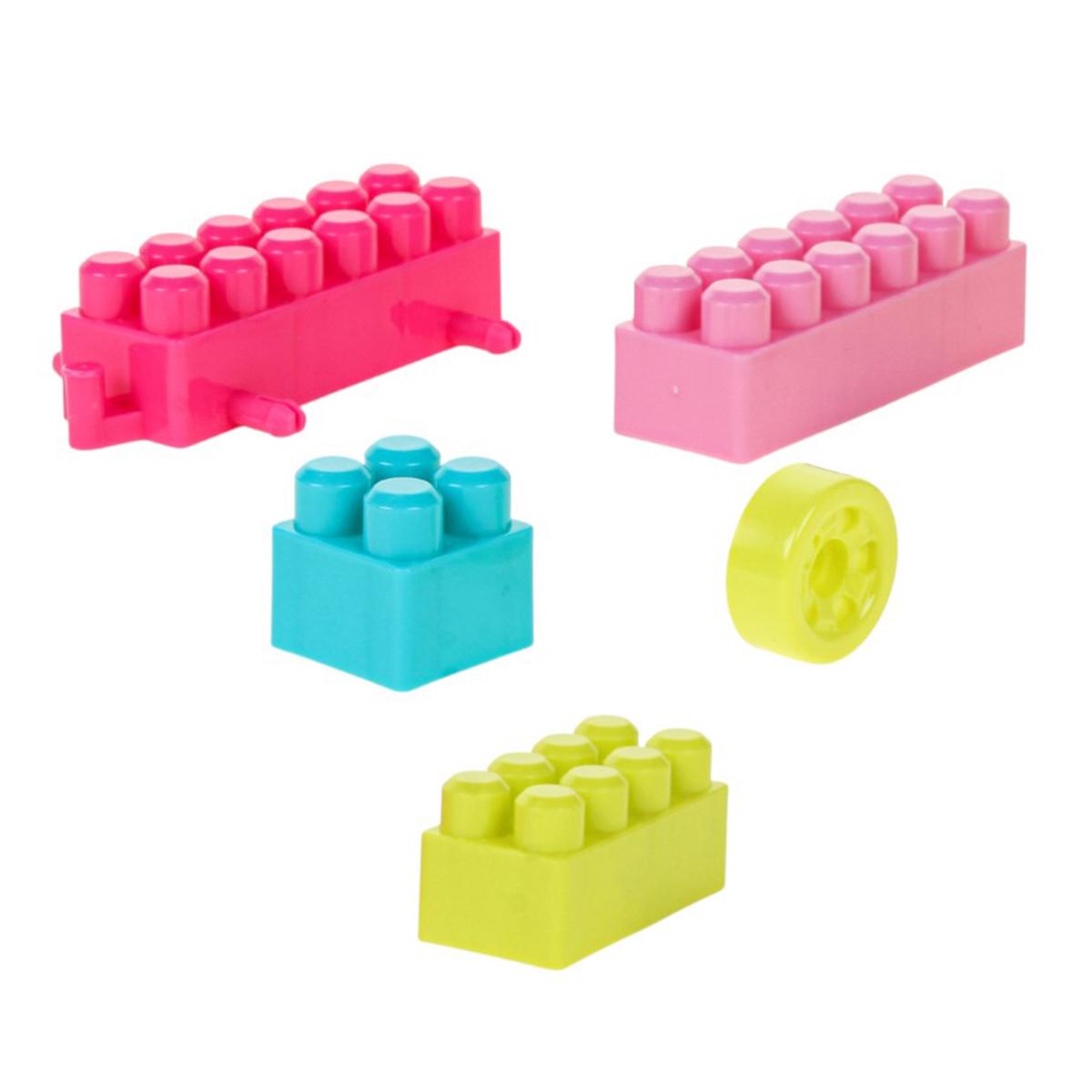 - 60 разноцветных деталей разных форм и размеров: классические блоки с шипами, колёса, круглые элементы и другие интересные части для сборки.