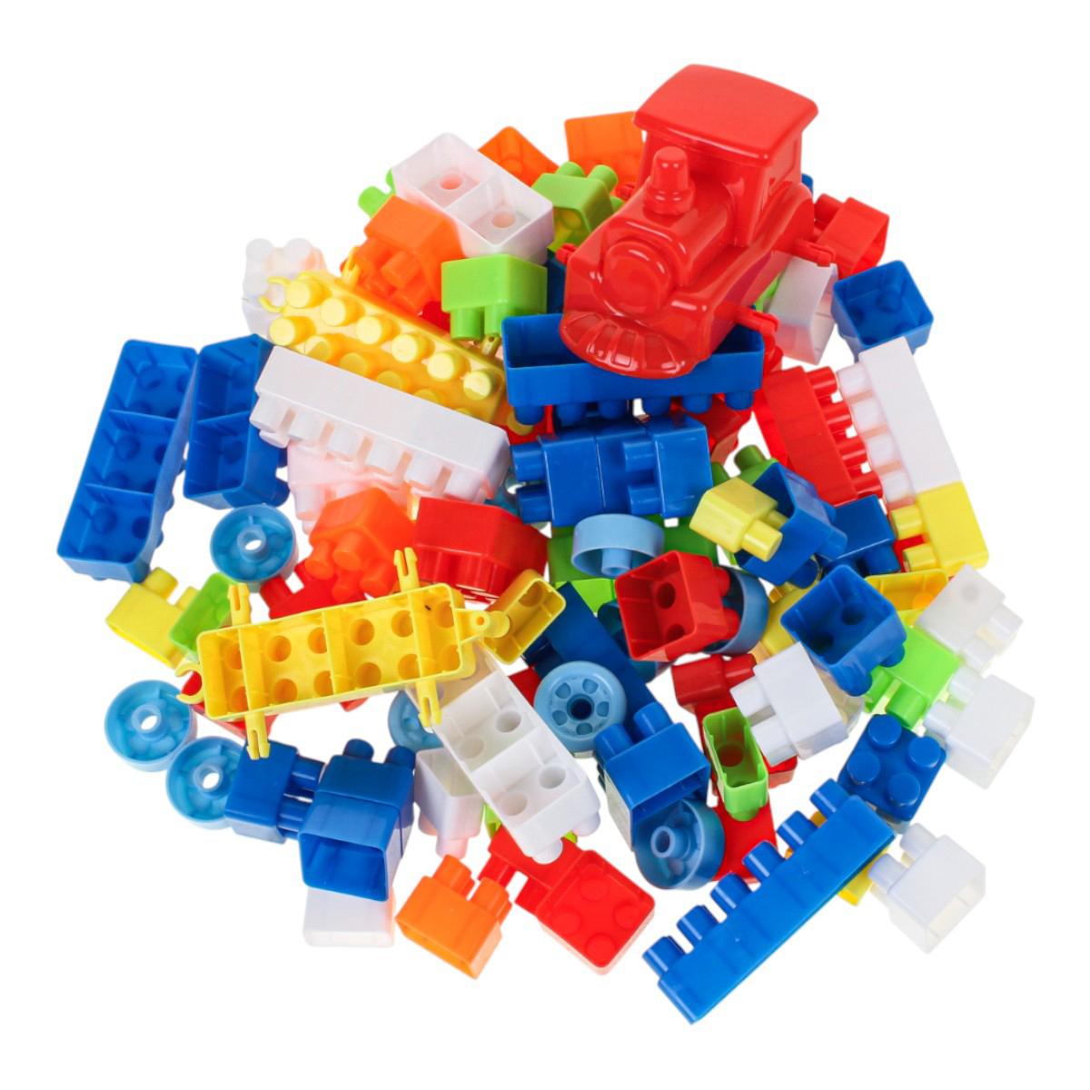 - 98 разноцветных пластиковых блочных деталей (красные, желтые, синие, зеленые, оранжевые, белые и другие).