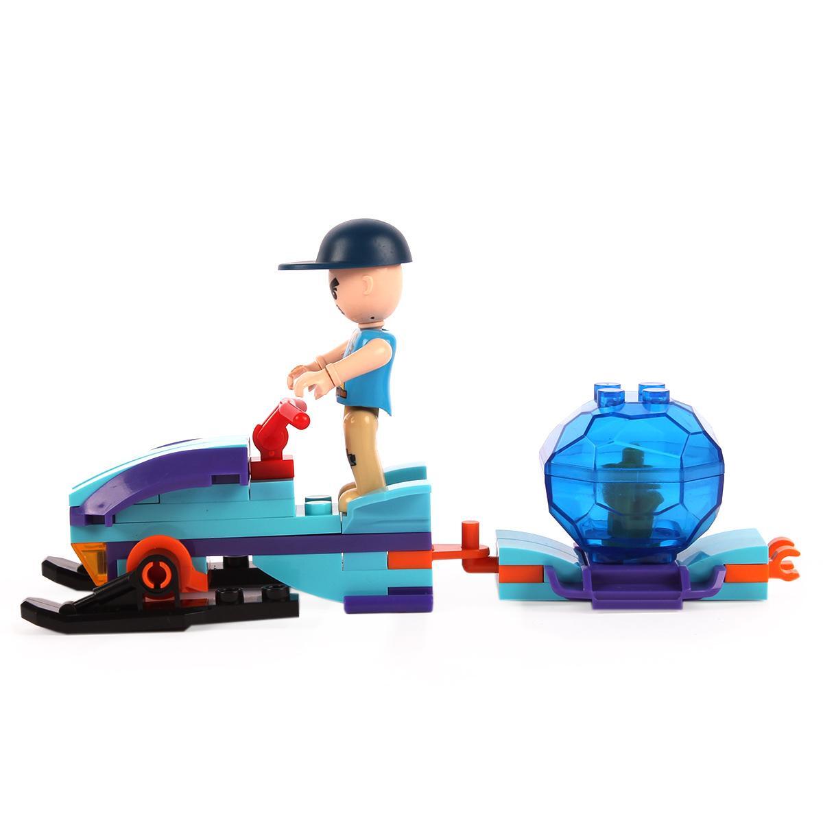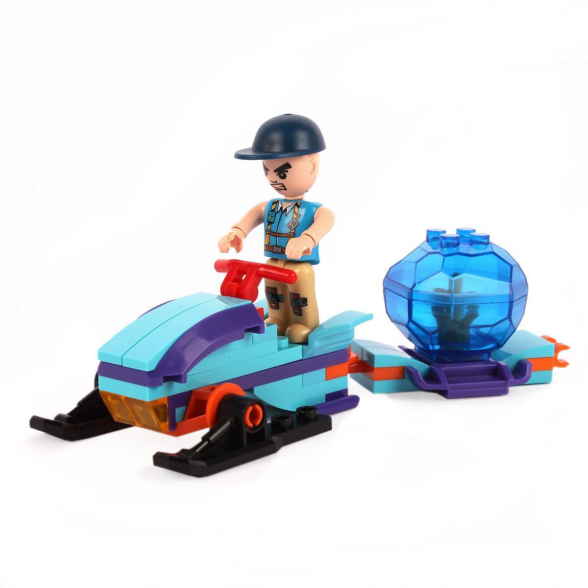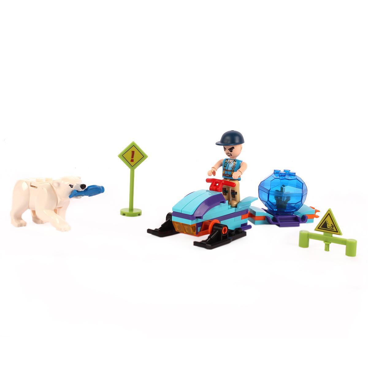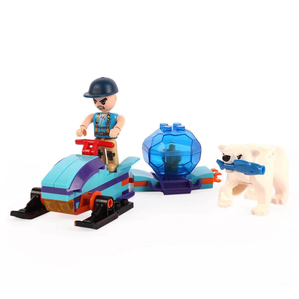 Конструктор подходит для детей от 6 лет, помогает развивать мелкую моторику, логику и творческое мышление. В набор входит снегоход, фигурки человека и животного, а также дорожные знаки, что позволяет моделировать разнообразные приключения в арктическом стиле.