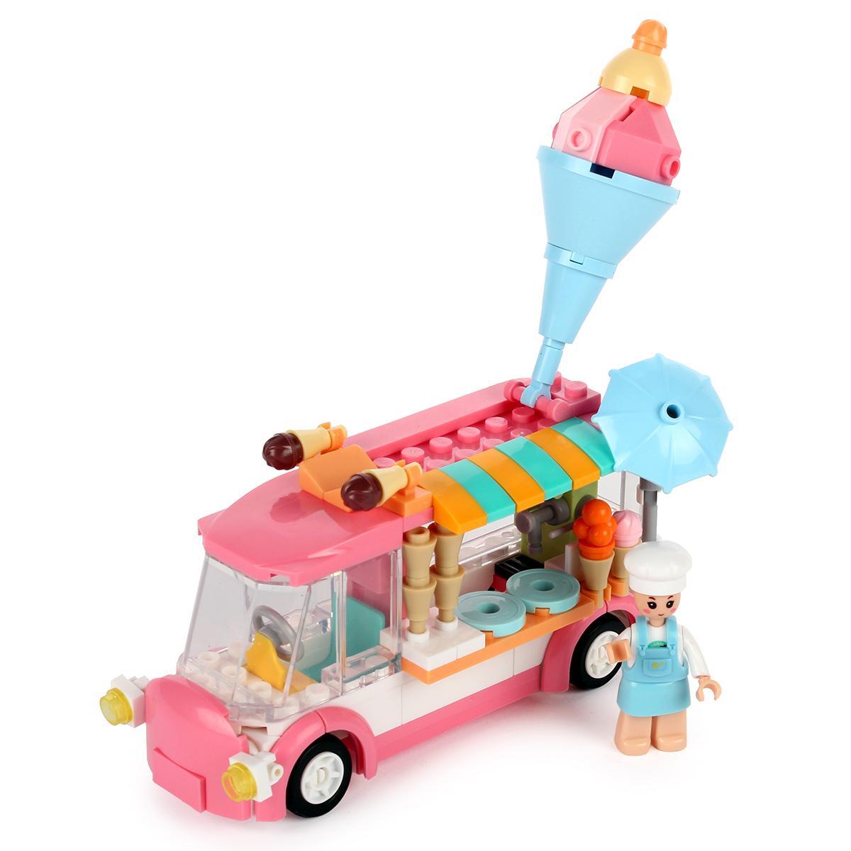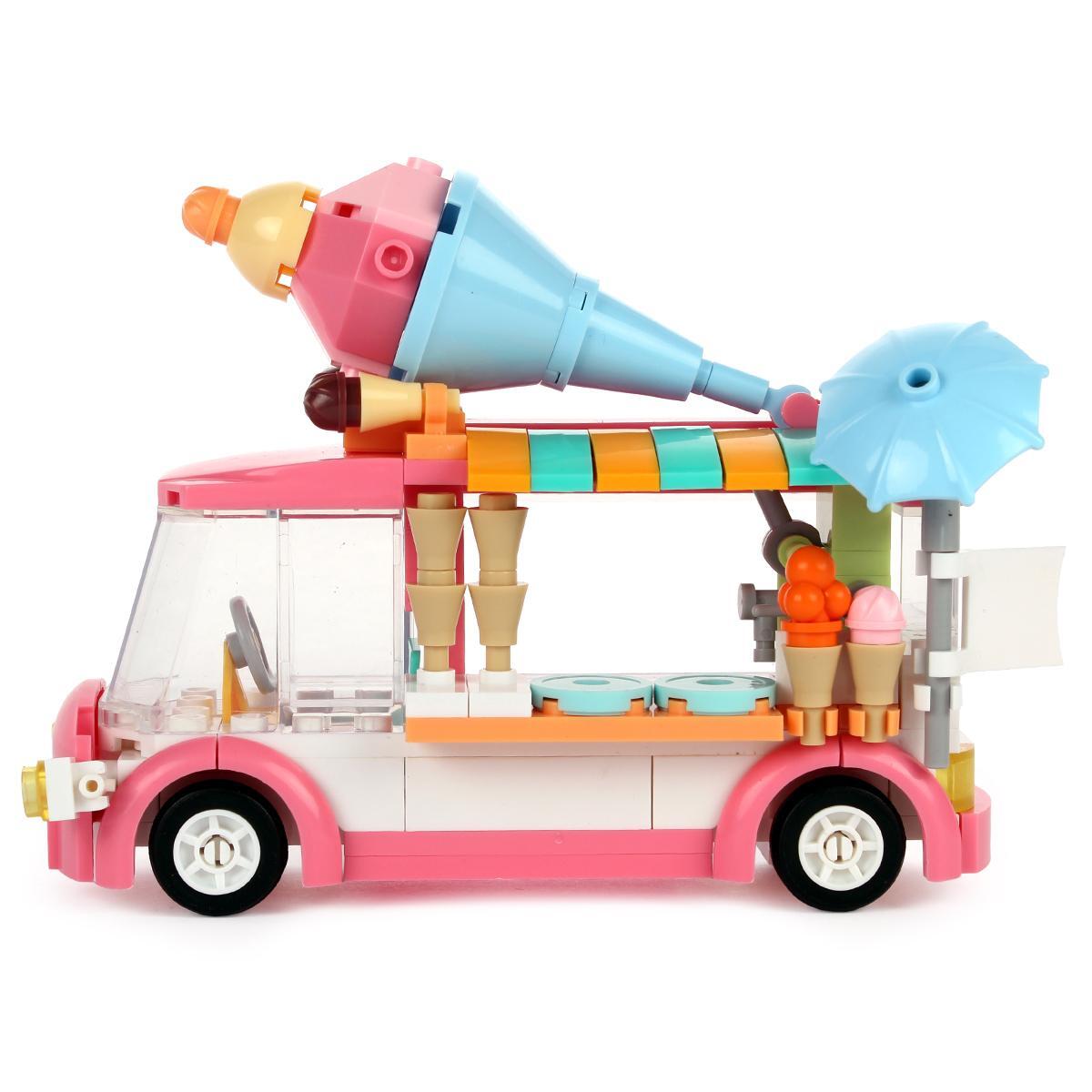 Сначала соберите фургон по инструкции, затем придумывайте новые сюжеты! Организуйте «продажу» мороженого, используя фигурки и аксессуары. Набор совместим с другими конструкторами серии, позволяя расширять игровое пространство.