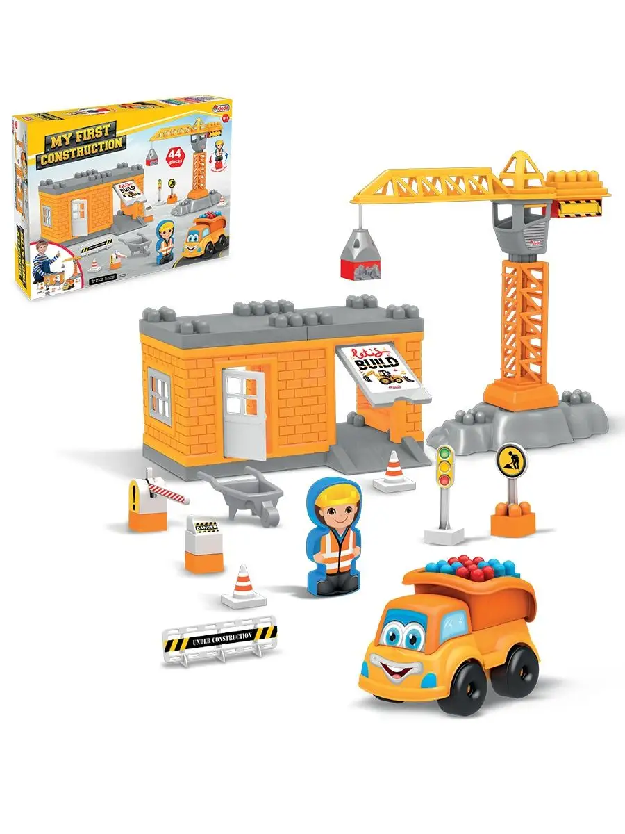 Конструктор включает в себя 44 детали, среди которых строительные блоки, краны, фигурки людей и транспорт. Все элементы имеют определенное предназначение, что позволяет ребенку самостоятельно организовывать сюжетные игры. Набор идеально подходит для детей, которые любят строить и создавать свои собственные истории.