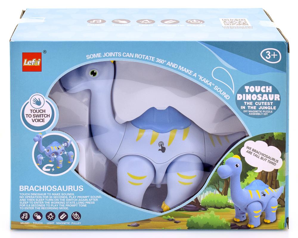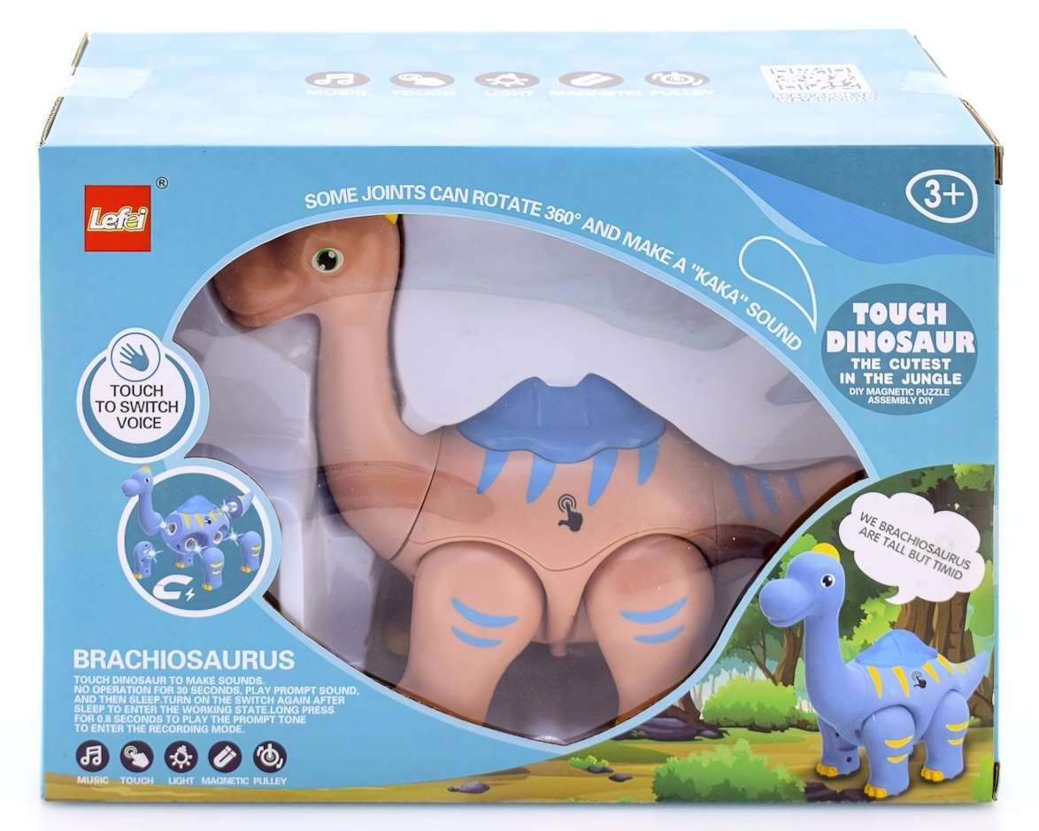 Игрушка предназначена для детей старше 3 лет и идеально подходит для развития моторики и воображения. Динозавр имеет магнитное крепление конечностей, что позволяет легко менять его позы и создавать различные игровые сценарии. При прикосновении к туловищу, динозавр может менять режим звука и записывать голос, что добавляет разнообразия в игру.