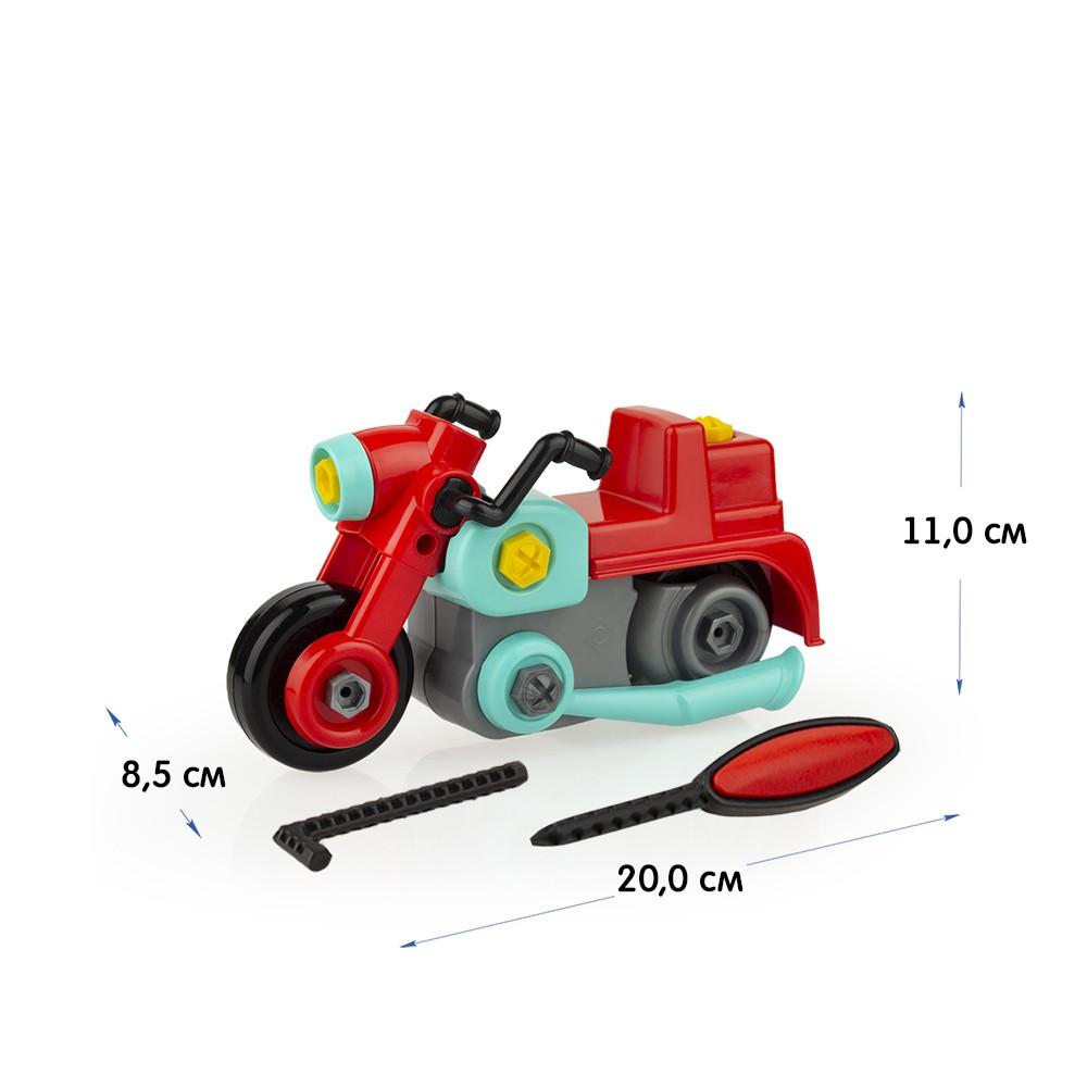 Конструктор подходит для детей от 3 лет и старше. Он поможет вашему ребенку научиться работать с инструментами и развивать навыки сборки. Игрушка выполнена из безопасного пластика, что делает ее идеальной для активной игры. Мотоцикл имеет размеры 20 см в длину, 8,5 см в ширину и 11 см в высоту, что делает его удобным для маленьких рук.