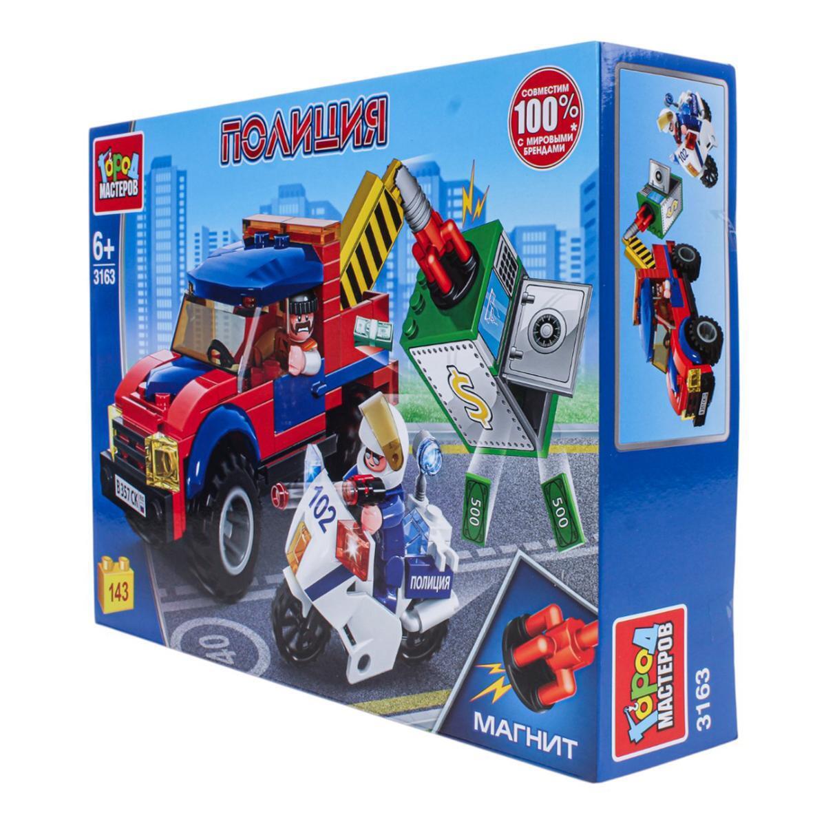 Конструктор включает в себя фигурку полицейского и магнит, что добавляет элемент интерактивности в игру. Все детали легко и плотно соединяются между собой, что позволяет создавать различные модели, включая полицейский автомобиль и мотоцикл. Набор совместим с моделями конструкций мировых брендов, что расширяет возможности для творчества.