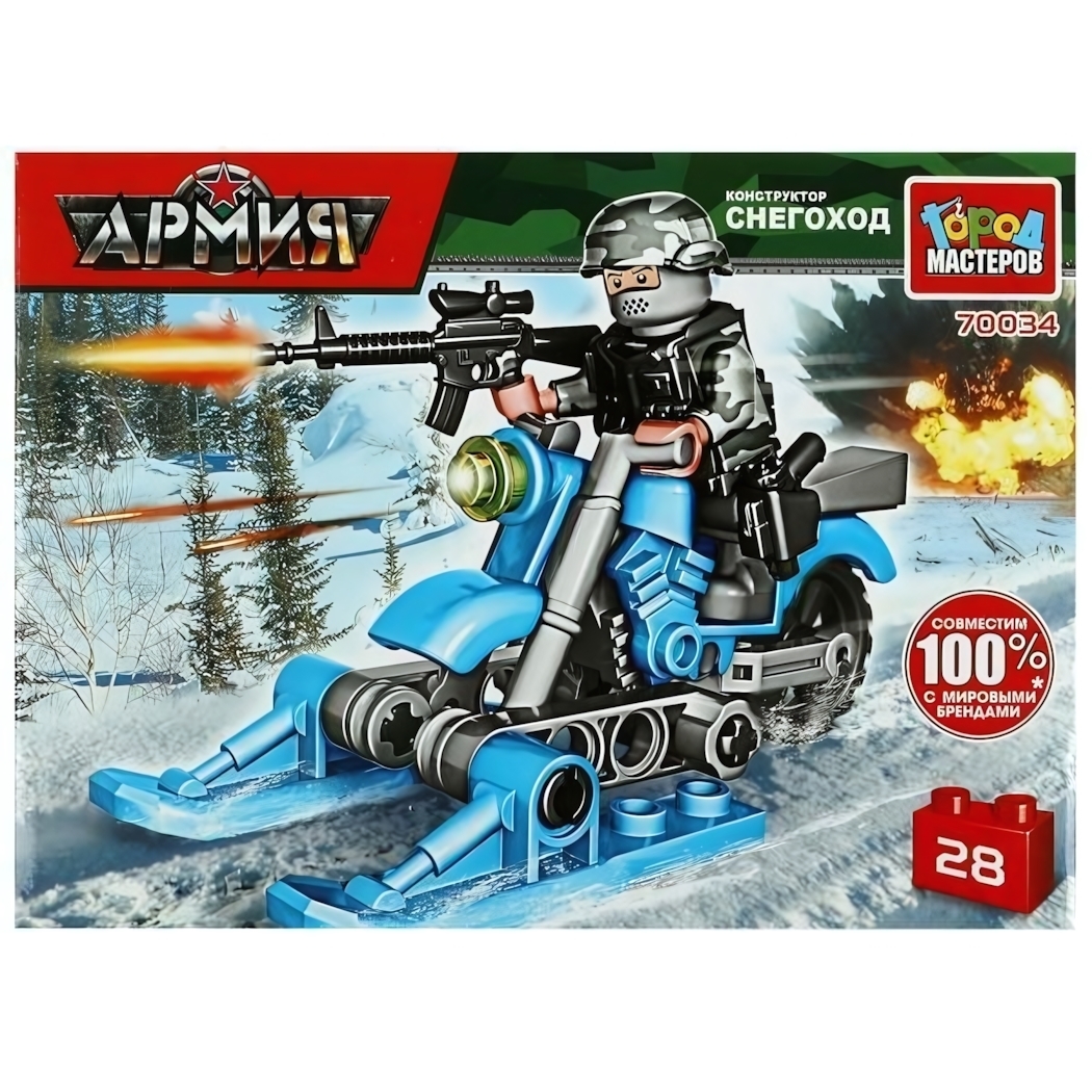 - Собирайте подвижную модель снегохода с фигуркой солдата в камуфляжной форме