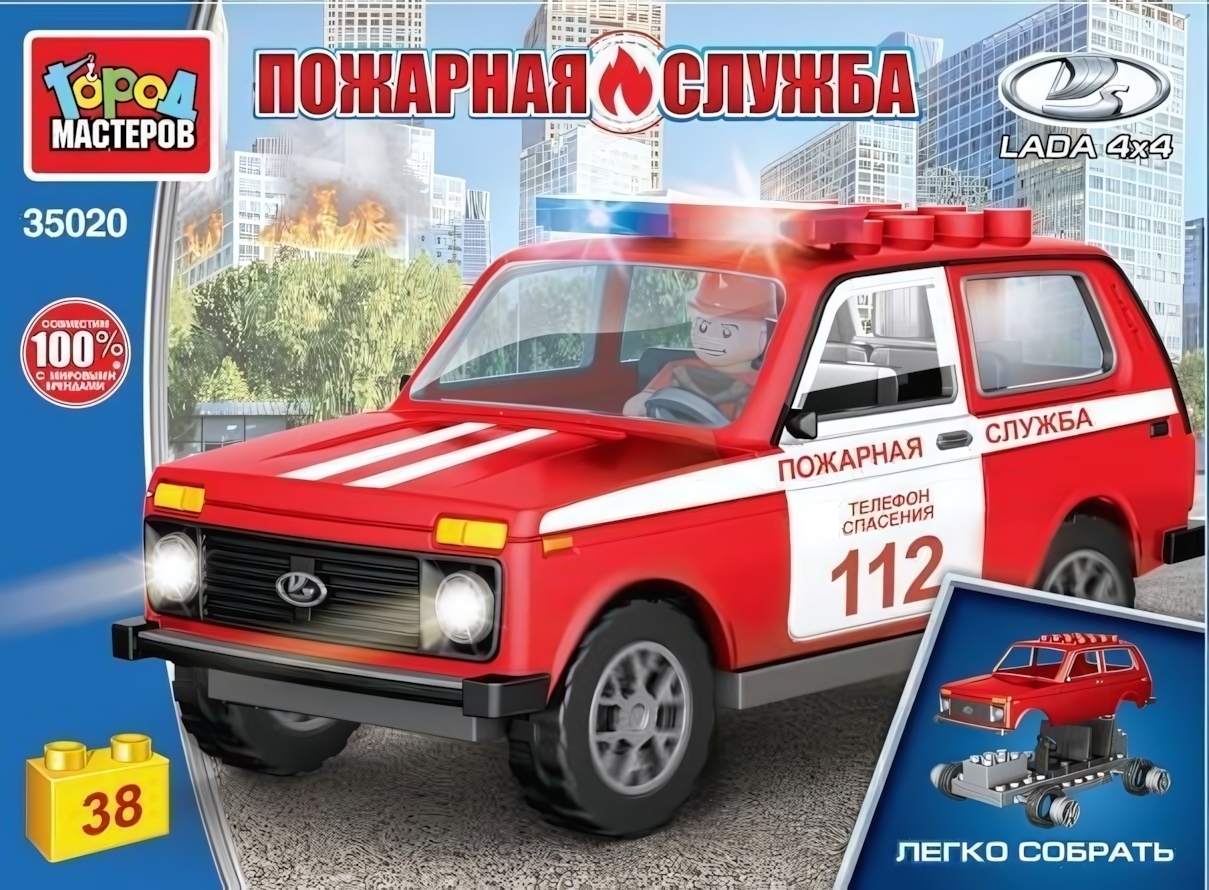 Этот пластиковый конструктор из 38 деталей позволяет вашему ребёнку собрать реалистичную модель автомобиля «Lada 4x4» в стиле пожарной службы. Рособеспечивает увлекательное развлечение для малышей от 4 лет, развивая мелкую моторику, внимание и логику.