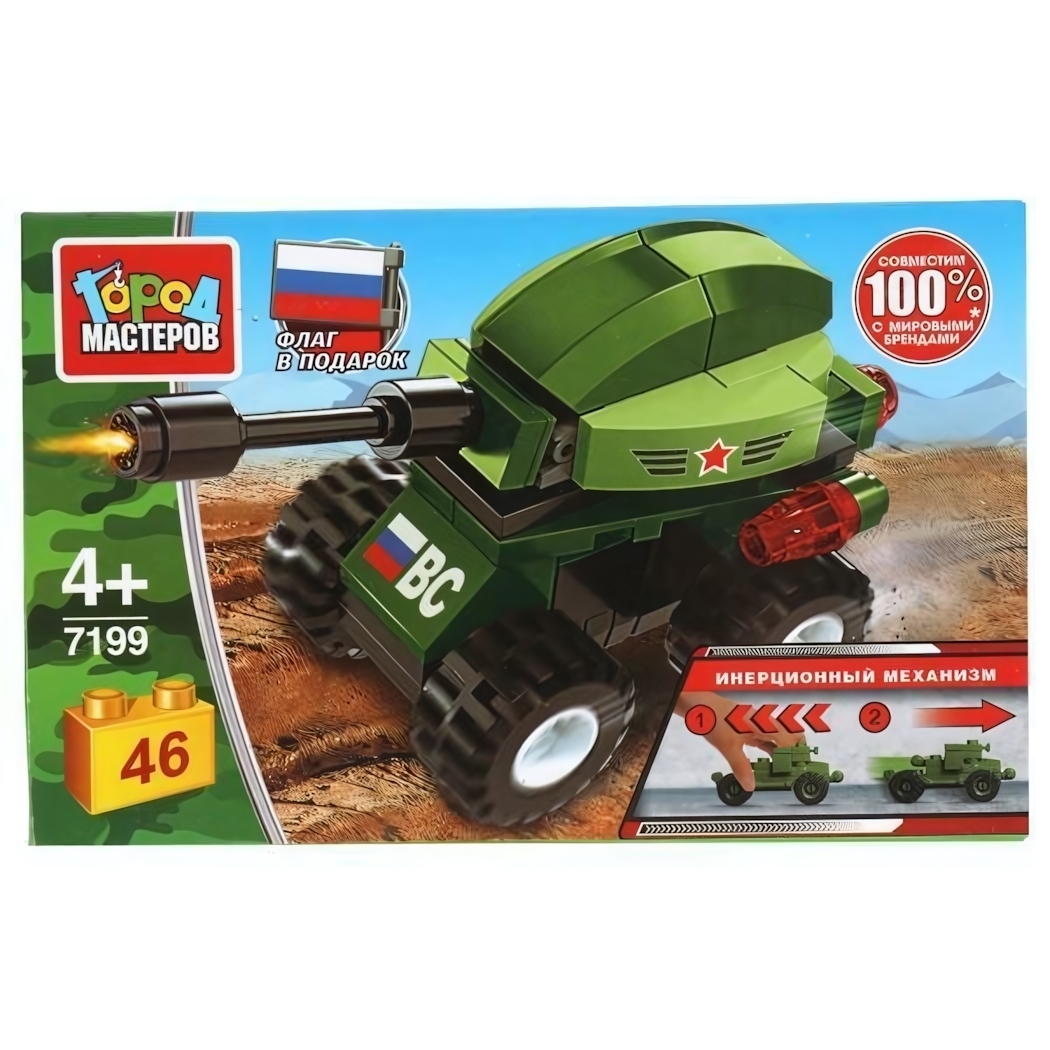 Этот пластиковый конструктор из 46 деталей подарит вашему ребенку увлекательное времяпрепровождение, а также поможет развить мелкую моторику, мышление и внимание. Благодаря инерционному механизму, собранная модель будет легко двигаться, создавая эффект настоящего танка, что делает игру более реалистичной и захватывающей.
