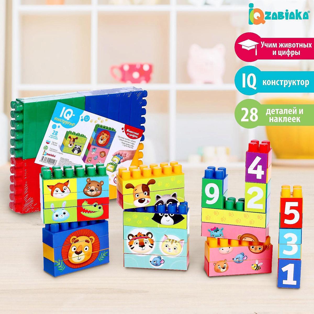 Набор включает 28 деталей и наклейки с изображениями животных и цифр. Ребёнок может приклеивать элементы, собирать тематические конструкции, придумывать собственные сюжеты и истории. Крупные блоки удобно держать маленькими руками, что делает конструктор подходящим для самостоятельной и совместной игры с родителями.