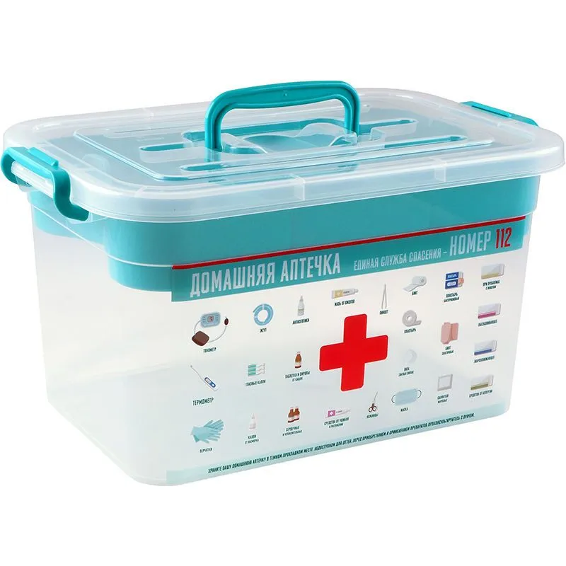 - Яркая информационная полоса с надписью "Домашняя аптечка" и номером единой службы спасения 112 сразу идентифицирует назначение контейнера и напоминает важный телефон в экстренной ситуации.