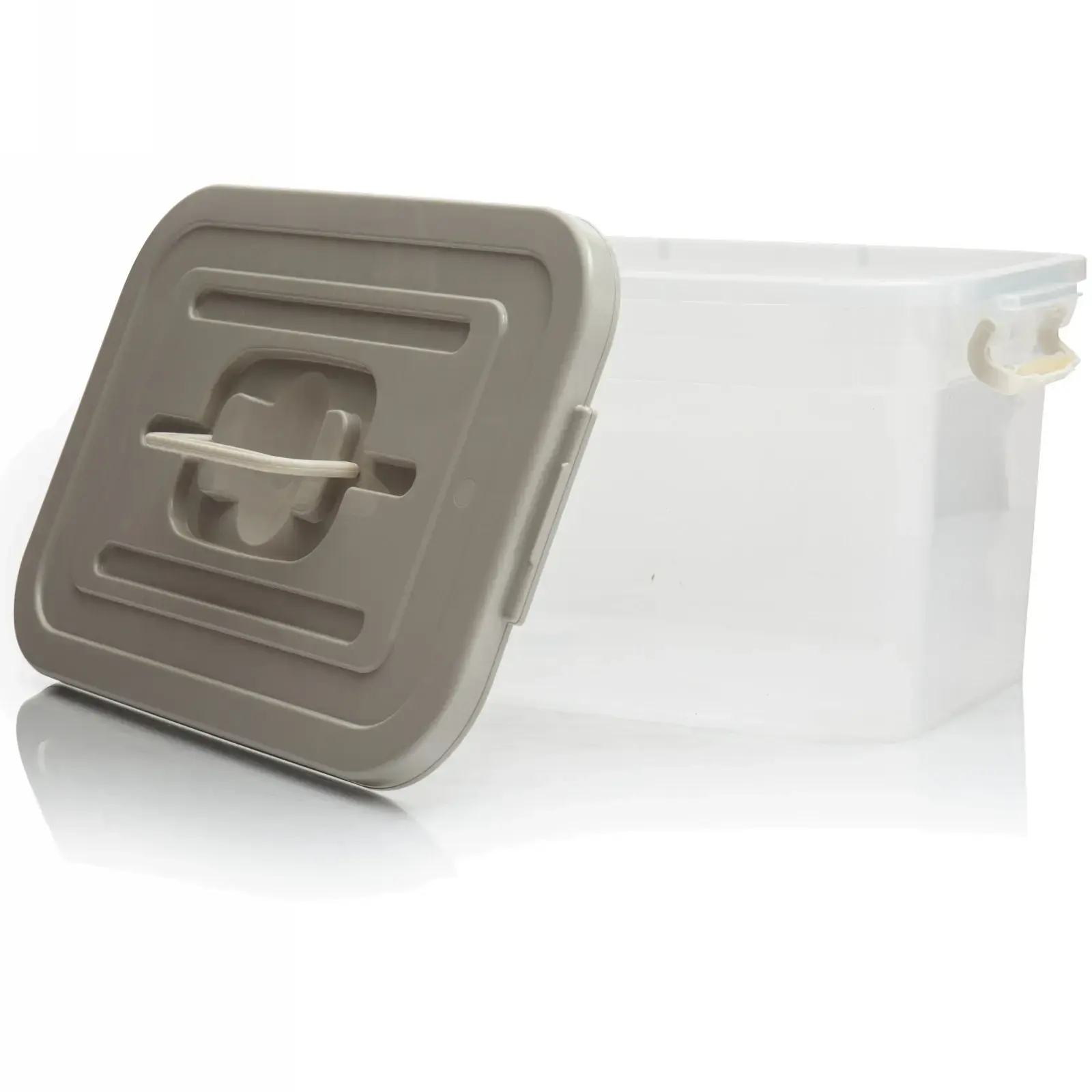 Контейнер имеет прямоугольную форму и выполнен из прозрачного материала, что позволяет видеть содержимое. Серый цвет крышки и ручек придает ему стильный вид, а гладкая поверхность облегчает уход. Размеры контейнера — 31 см в длину, 20 см в ширину и 18 см в высоту, что делает его идеальным для хранения в шкафах и на полках.