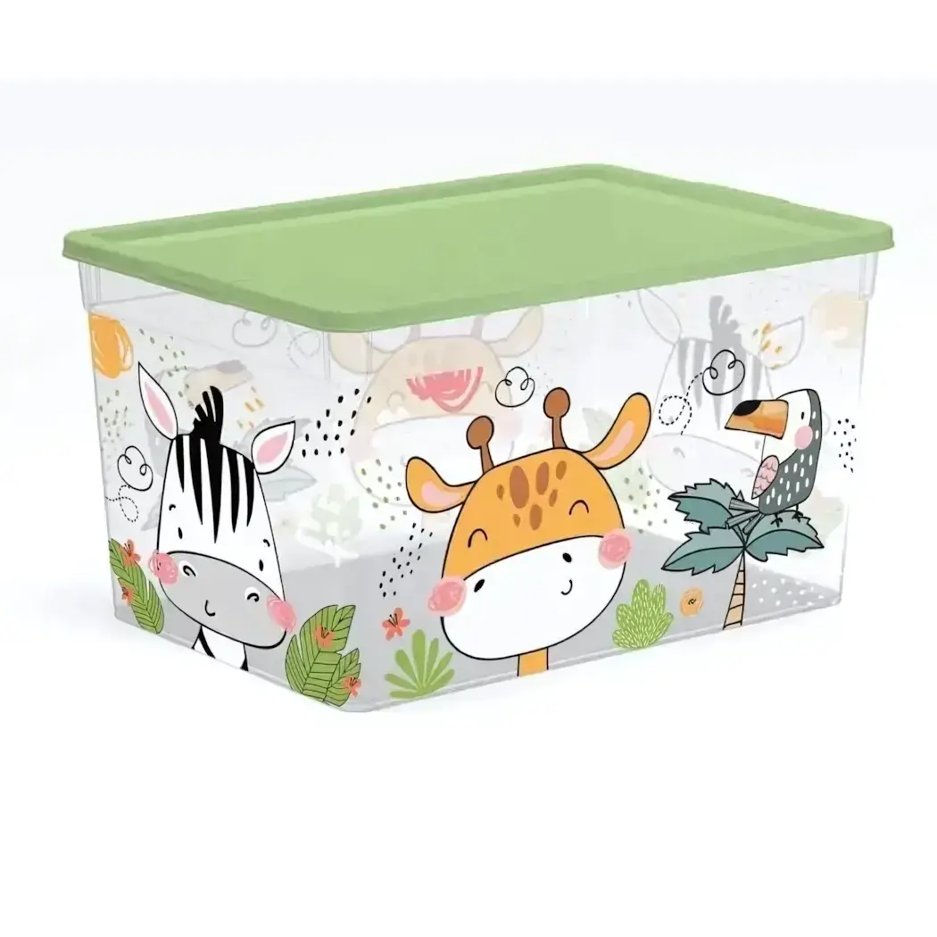 Контейнер выполнен из прочного прозрачного пластика, что позволяет легко видеть содержимое. Крышка контейнера надежно закрывает его, защищая от пыли и загрязнений. Яркий зеленый цвет крышки и милые иллюстрации животных, таких как жираф и зебра, делают контейнер не только практичным, но и стильным элементом интерьера.