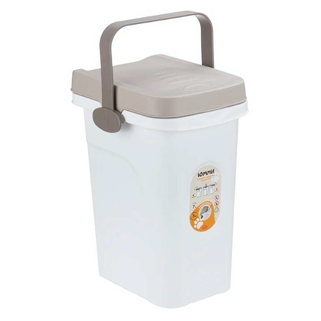 Объем контейнера — 7 литров, он вмещает примерно 3 кг сухого корма. Материал — прочный и безопасный полипропилен. Размеры выполнены так, чтобы удобно разместить его в ограниченных пространствах. Контейнер соответствует высоким стандартам качества и изготовлен в России компанией М-ПЛАСТИКА ООО.