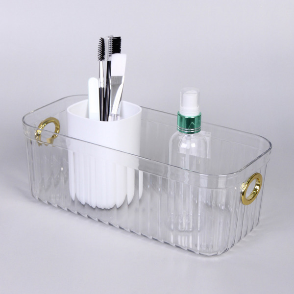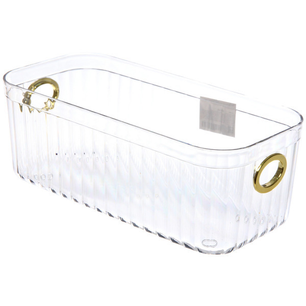 Контейнер идеально подходит для хранения косметики, туалетных принадлежностей или канцелярских товаров. Его размеры 26х12х9,8 см делают его универсальным для использования в ванной, на столе или в шкафу. Благодаря закругленным краям и рифленой поверхности, контейнер удобно держать в руках, а золотистые ручки добавляют удобства при переноске.