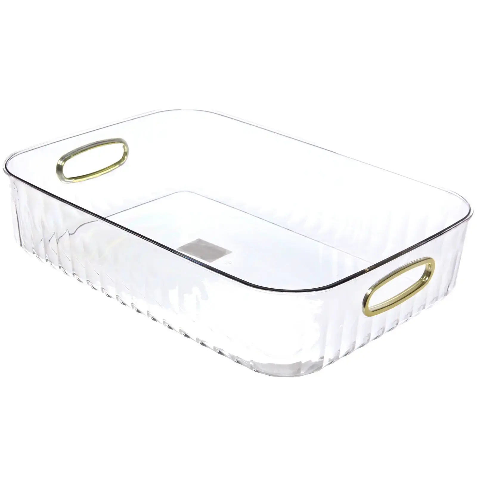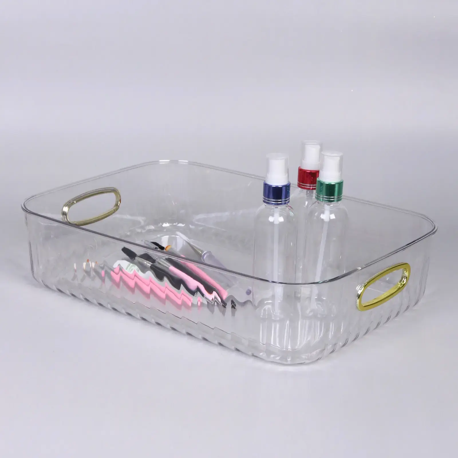 Контейнер подходит для хранения косметики, канцелярских принадлежностей и других мелких предметов. Благодаря гладкой поверхности и рифленой текстуре по бокам, он не только функционален, но и эстетически привлекателен. Золотистые ручки добавляют стильный акцент, делая его удобным в использовании.
