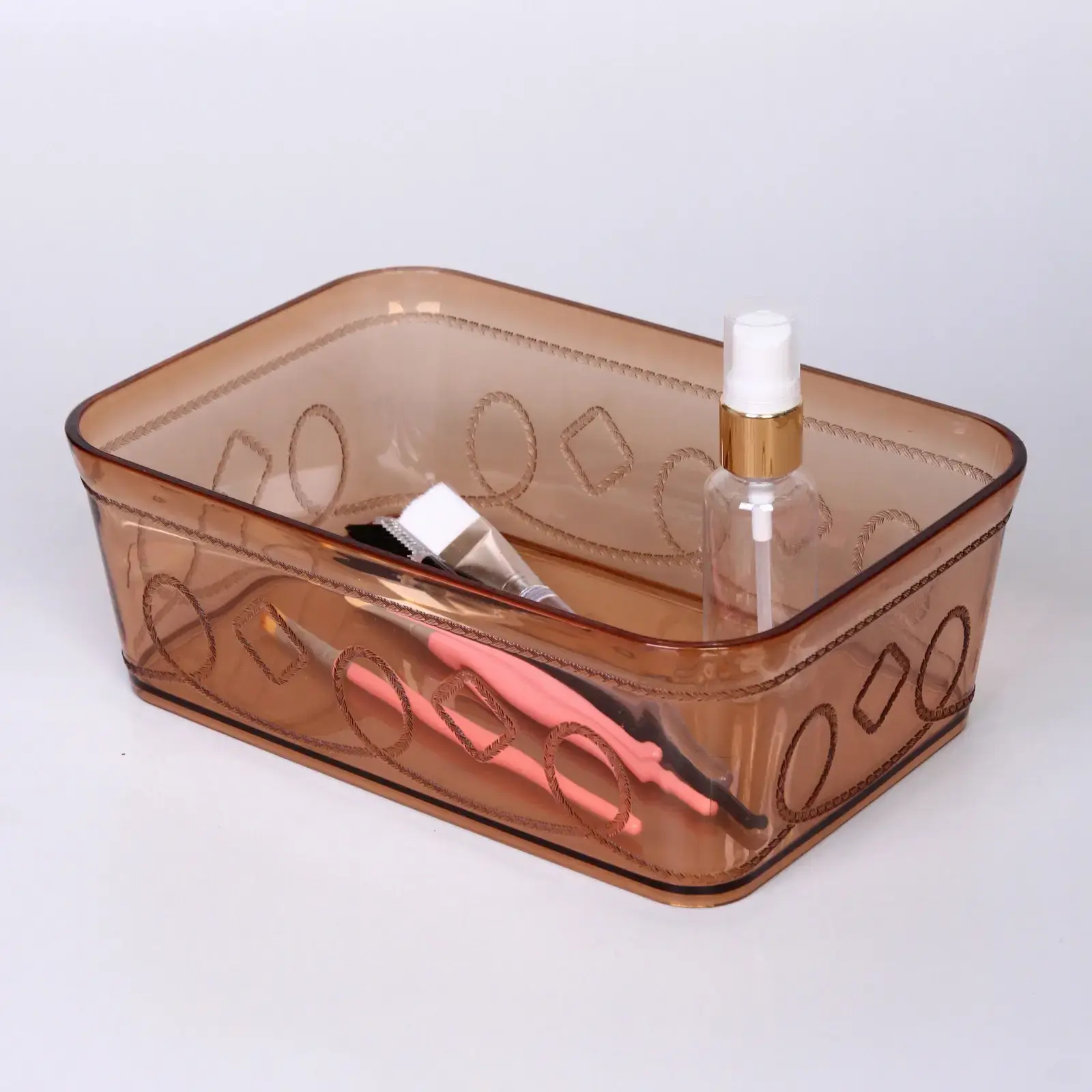 Почему стоит выбрать именно этот контейнер? Во-первых, он выполнен из качественного пластика, что обеспечивает долговечность и надежность. Во-вторых, его стильный дизайн с рельефным узором в виде ромбов и овалов делает его не только практичным, но и эстетически привлекательным. Вы сможете легко организовать свои вещи и при этом не жертвовать стилем.