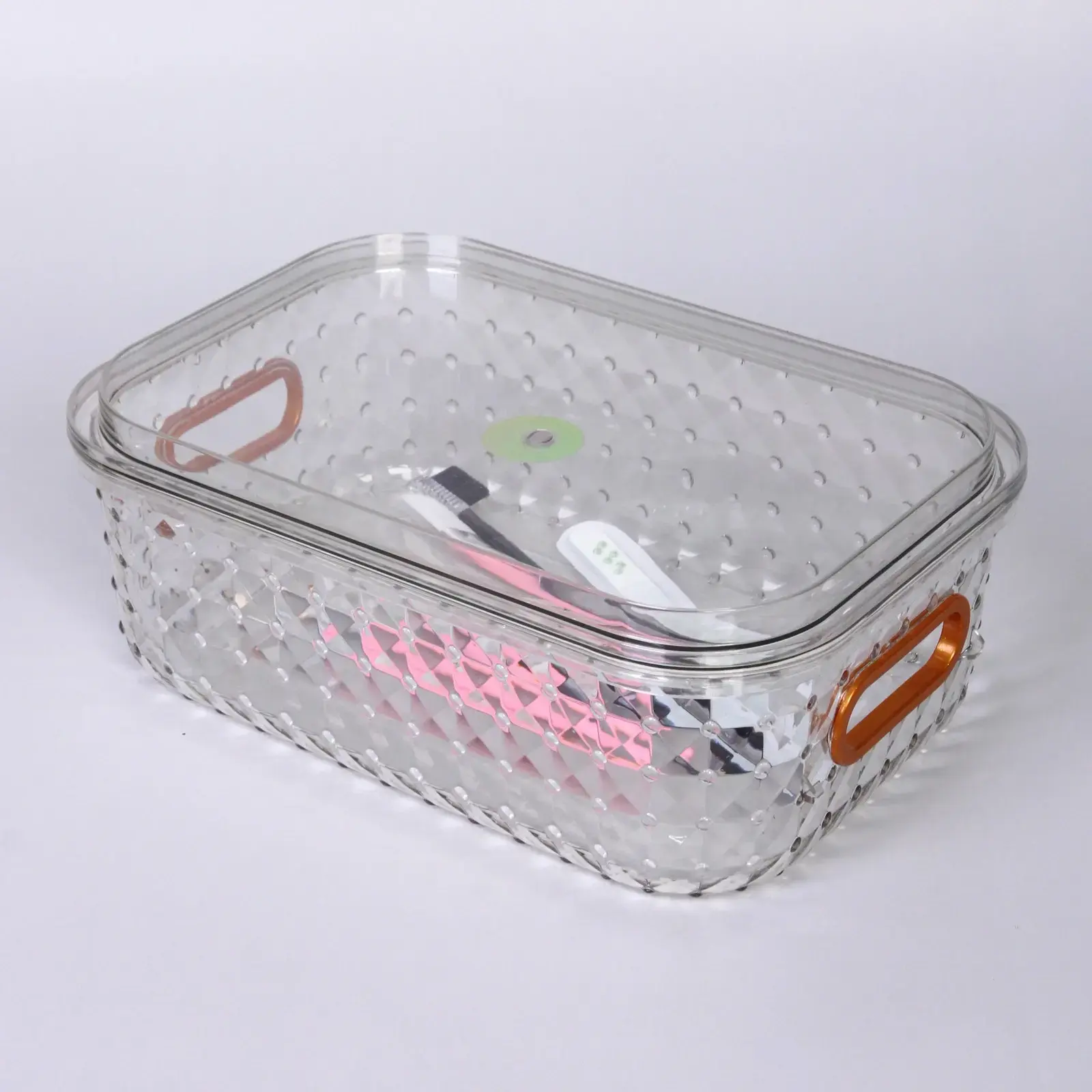 Размеры контейнера составляют 25 см в длину, 17 см в ширину и 8.5 см в высоту. Прозрачный материал позволяет видеть содержимое, а коричневые ручки добавляют контраст и удобство. Этот контейнер станет отличным выбором для тех, кто ценит порядок и стиль в своем доме.