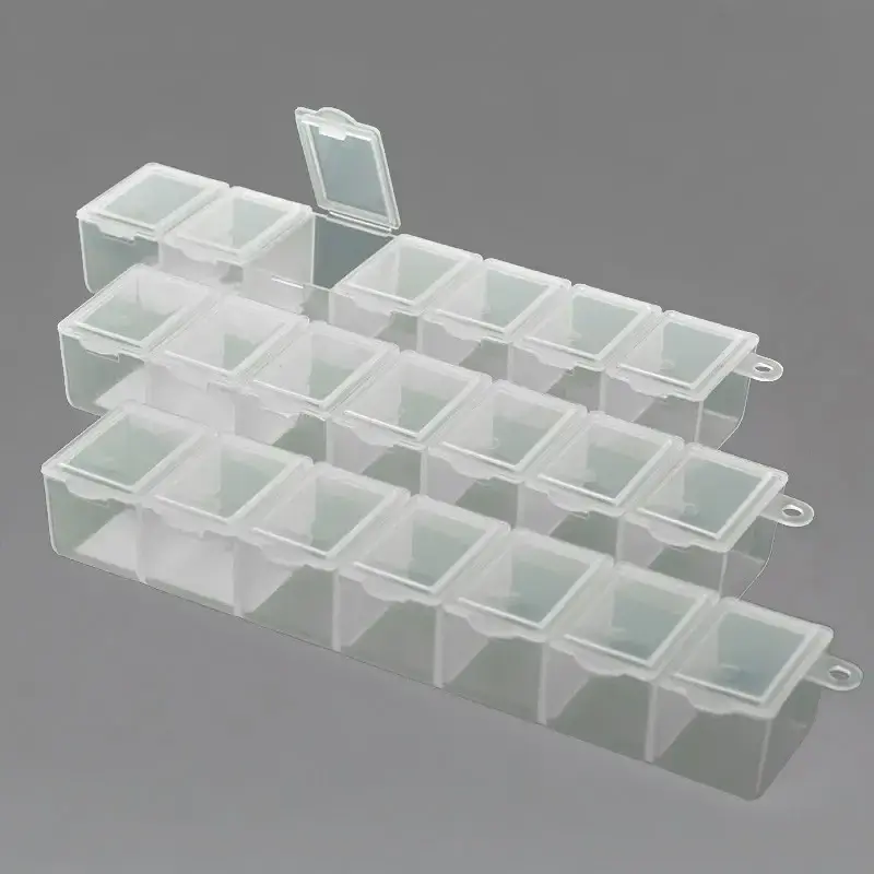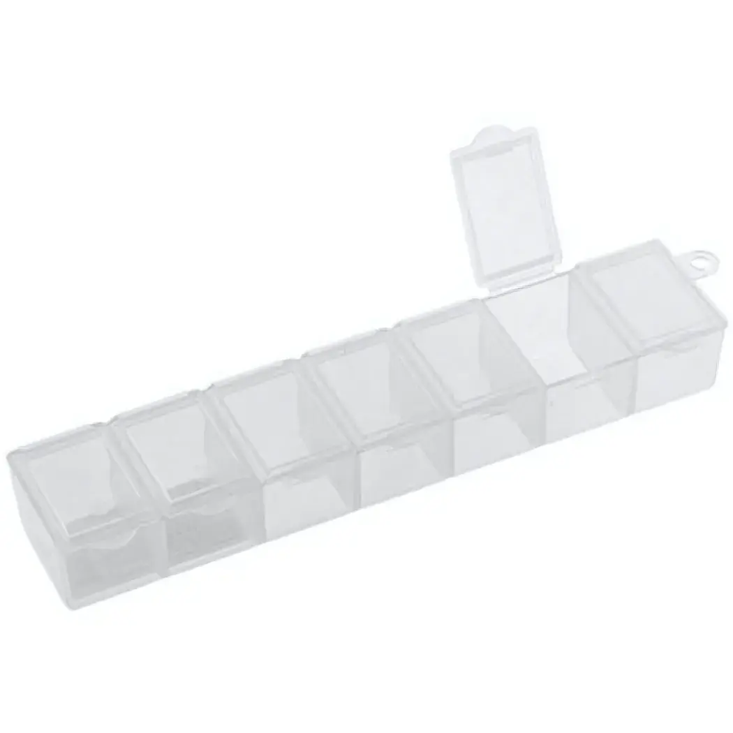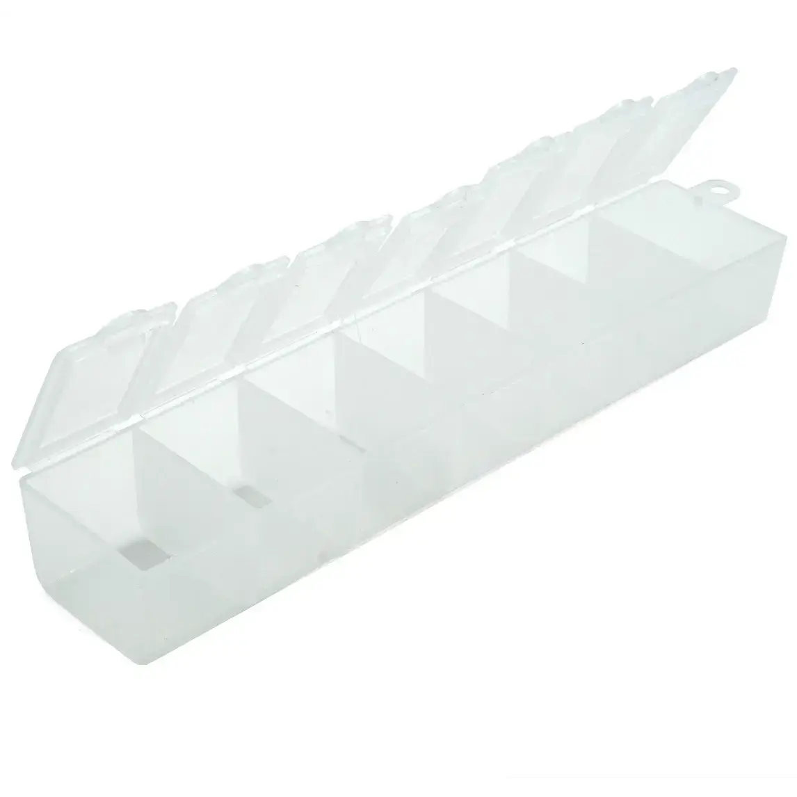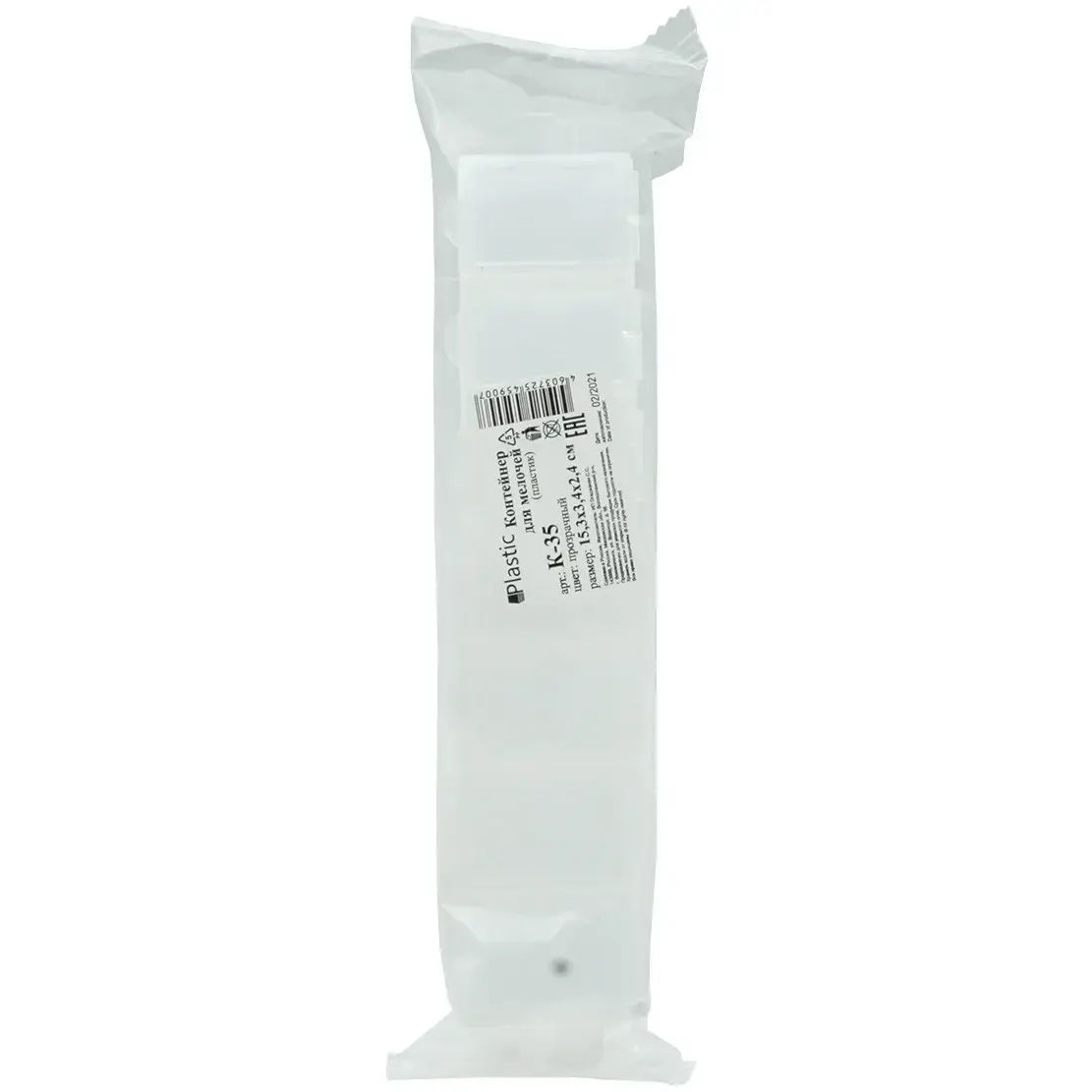 Контейнер выполнен из прочного прозрачного пластика, что гарантирует его долговечность. Размеры контейнера составляют 15,3 см в длину, 3,4 см в ширину и 2,4 см в высоту. Каждый отсек имеет одинаковый размер, что позволяет удобно размещать в них мелкие предметы. Благодаря закруглённым углам и гладкой поверхности, контейнер легко чистится и не повреждает содержимое.