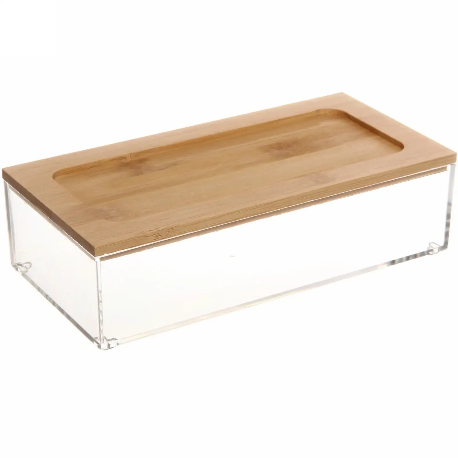 Прозрачные стенки позволяют видеть содержимое, что экономит время при поиске нужных вещей. Деревянная крышка с удобным вдавлением обеспечивает легкий доступ к содержимому, а также защищает от пыли и влаги.