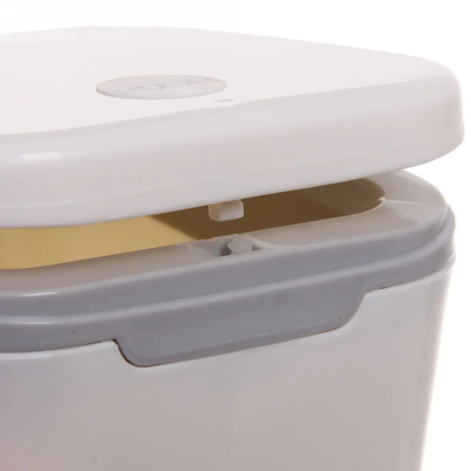 Контейнер имеет прямоугольную форму с округлыми углами, что облегчает его размещение в ограниченных пространствах. Его размеры идеально подходят для использования на кухне, в ванной или в офисе. Белый цвет и гладкая поверхность делают его легким в уходе и поддержании чистоты.