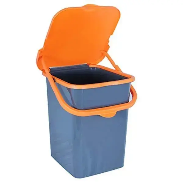 Прямоугольная форма (35х29.5х34.5см) позволяет компактно размещать контейнеры вдоль стен или в углах помещений. Контрастное сочетание серого корпуса с оранжевой крышкой помогает быстро идентифицировать ёмкости для разных типов отходов.