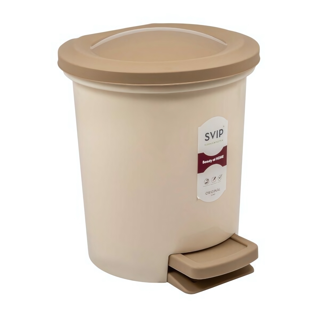 Изготовленное из высококачественного пластика, ведро сохраняет первоначальный цвет даже при интенсивном использовании. Объём 6 литров оптимален для установки под раковиной или в ограниченном пространстве. Цилиндрическая форма с кремовым корпусом и тёмно-бежевой крышкой органично впишется в любой современный интерьер.
