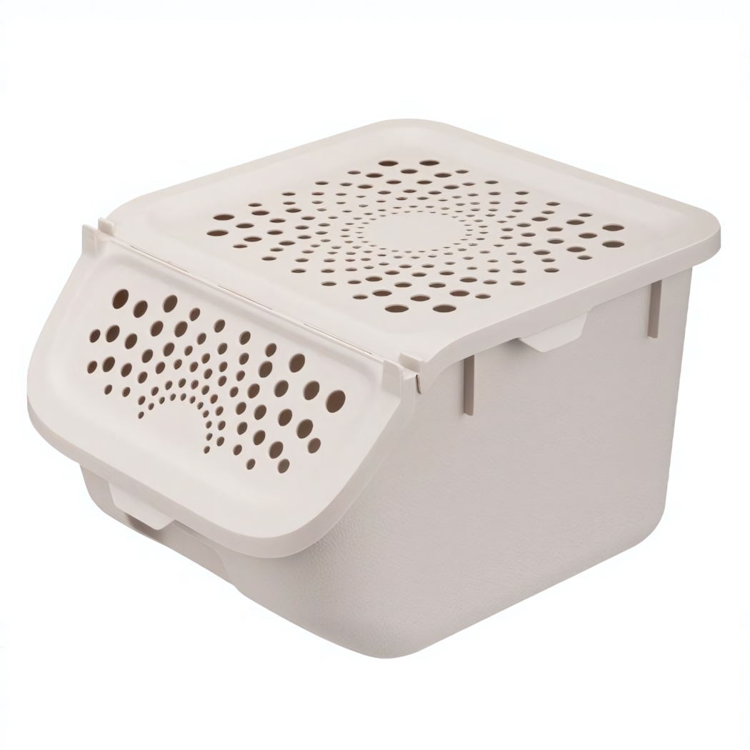 Контейнер можно ставить друг на друга, что позволяет оптимизировать пространство на кухне, балконе или в кладовой. Полностью снимаемая крышка обеспечивает легкий доступ к содержимому, а многочисленные вентиляционные отверстия способствуют естественной циркуляции воздуха, предотвращая гниение и сохраняя свежесть овощей.